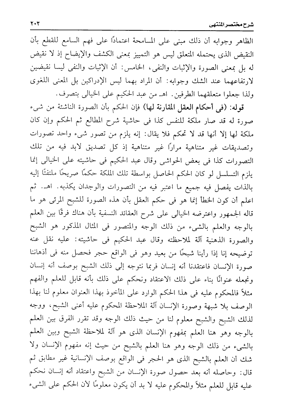 الظاهر وجوابه أن ذلك مبنى على المسامحة اعتمادًا على فهم السامع للقطع بأن النقيض الذى يحتمله المتعلق ليس هو التمييز بمعنى الكشف والإيضاح إذ لا نقيض له بل بمعنى الصورة والإثبات والنفى، الخامس: أن الإثبات والنفى ليسا نقضين لارتفاعهما عند الشك وجوابه: أن المراد بهما ليس الإدراكين بل المعنى اللغوى ولذا جعلوا متعلقهما الطرفين. اهـ من عبد الحكيم على الخيالى بتصرف.