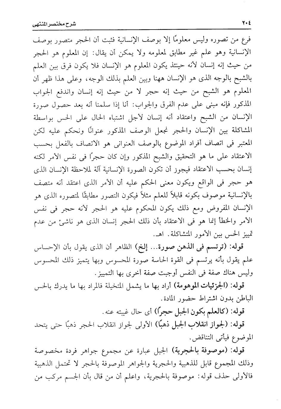 فرع من تصوره وليس معلومًا إلا بوصف الإنسانية فثبت أن الحجر متصور بوصف الإنسانية وهو علم غير مطابق لمعلومه ولا يمكن أن يقال: إن المعلوم هو الحجر من حيث إنه إنسان لأنه حينئذ يكون العلوم هو الإنسان فلا يكون فرق بين العلم بالشبح بالوجه الذى هو الإنسان ههنا وبين العلم بذلك الوجه، وعلى هذا ظهر أن المعلوم هو الشبح من حيث إنه حجر لا من حيث إنه إنسان واندفع الجواب المذكور فإنه مبنى على عدم الفرق والجواب: أنا إذا سلمنا أنه بعد حصول صورة الإنسان من الشبح واعتقاد أنه إنسان لأجل اشتباه الحال على الحس بواسطة المشاكلة بين الإنسان والحجر نجعل الوصف المذكور عنوانًا ونحكم عليه لكن المعتبر فى اتصاف أفراد الموضوع بالوصف العنوانى هو الاتصاف بالفعل بحسب الاعتقاد على ما هو التحقيق والشبح المذكور وإن كان حجرًا فى نفس الأمر لكنه إنسان بحسب الاعتقاد فيجوز أن تكون الصورة الإنسانية آلة لملاحظة الإنسان الذى هو حجر فى الواقع ويكون معنى الحكم عليه أن الأمر الذى اعتقد أنه متصف بالإنسانية موصوف بكونه قابلًا للعلم مثلًا فيكون التصور مطابقًا لمتصوره الذى هو الإنسان المفروض ومع ذلك يكون المحكوم عليه هو الحجر لأنه حجر فى نفس الأمر والخطأ إنما هو فى الاعتقاد بأن ذلك الحجر إنسان الذى هو ناشئ من عدم تمييز الحس بين الأمور المتشاكلة. اهـ.