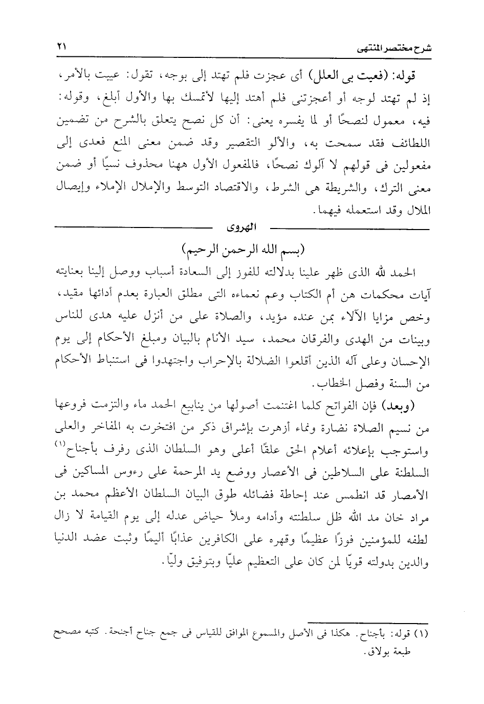 الحمد للَّه الذى ظهر علينا بدلالته للفوز إلى السعادة أسباب ووصل إلينا بعنايته آيات محكمات هن أم الكتاب وعم نعماءه التى مطلق العبارة بعدم أدائها مقيد، وخص مزايا الآلاء بمن عنده مؤيد، والصلاة على من أنزل عليه هدى للناس وبينات من الهدى والفرقان محمد، سيد الأنام بالبيان ومبلغ الأحكام إلى يوم الإحسان وعلى آله الذين أقلعوا الضارلة بالإحراب واجتهدوا فى استنباط الأحكام من السنة وفصل الخطاب.