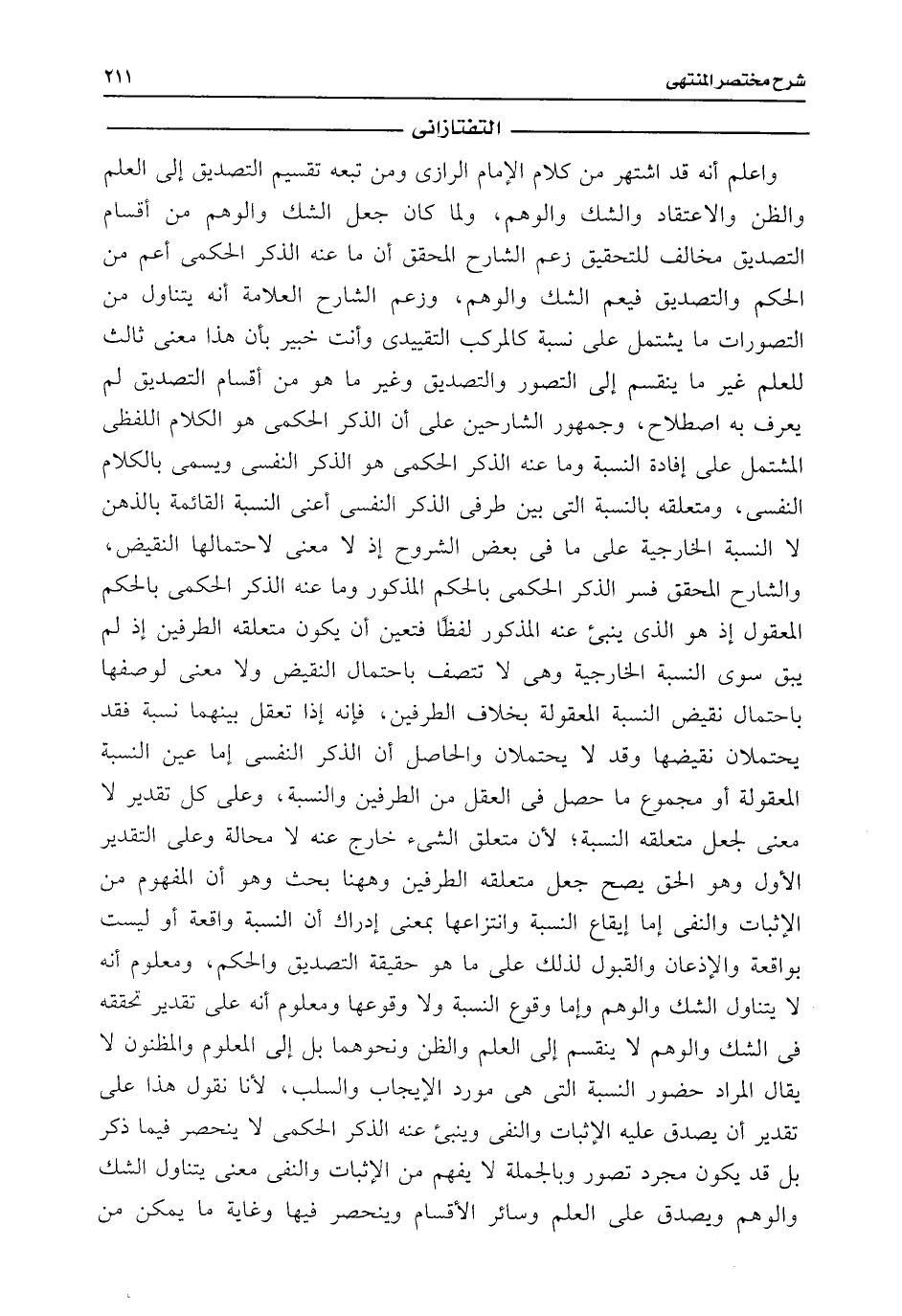 واعلم أنه قد اشتهر من كلام الإمام الرازى ومن تبعه تقسيم التصديق إلى العلم والظن والاعتقاد والشك والوهم، ولما كان جعل الشك والوهم من أقسام التصديق مخالف للتحقيق زعم الشارح المحقق أن ما عنه الذكر الحكمى أعم من الحكم والتصديق فيعم الشك والوهم، وزعم الشارح العلامة أنه يتناول من التصورات ما يشتمل على نسبة كالمركب التقييدى وأنت خبير بأن هذا معنى ثالث للعلم غير ما ينقسم إلى التصور والتصديق وغير ما هو من أقسام التصديق لم يعرف به اصطلاح، وجمهور الشارحين على أن الذكر الحكمى هو الكلام اللفظى المشتمل على إفادة بالنسبة وما عنه الذكر الحكمى هو الذكر النفسى ويسمى بالكلام النفسى، ومتعلقه بالنسبة التى بين طرفى الذكر النفسى أعنى النسبة القائمة بالذهن لا النسبة الخارجية على ما فى بعض الشروح إذ لا معنى لاحتمالها النقيض، والشارح المحقق فسر الذكر الحكمى بالحكم المذكور وما عنه الذكر الحكمى بالحكم المعقول إذ هو الذى ينبئ عنه المذكور لفظًا فتعين أن يكون متعلقه الطرفين إذ لم يبق سوى النسبة الخارجية وهى لا تتصف باحتمال النقيض ولا معنى لوصفها باحتمال نقيض النسبة المعقولة بخلاف الطرفين، فإنه إذا تعقل بينهما نسبة فقد يحتملان نقيضها وقد لا يحتملان والحاصل أن الذكر النفسى إما عين النسبة المعقولة أو مجموع ما جعل فى العقل من الطرفين والنسبة، وعلى كل تقدير لا معنى لجعل متعلقه النسبة؛ لأن متعلق الشئ خارج عنه لا محالة وعلى التقدير الأول وهو الحق يصح جعل متعلقه الطرفين وههنا بحث وهو أن المفهوم من الإثبات والنفى إما إيقاع النسبة وانتزاعها بمعنى إدراك أن النسبة واقعة أو ليست بواقعة والإذعان والقبول لذلك على ما هو حقيقة التصديق والحكم، ومعلوم أنه لا يتناول الشك والوهم وإما وقوع النسبة ولا وقوعها ومعلوم أنه على تقدير تحققه فى الشك والوهم لا ينقسم إلى العلم والظن ونحوهما بل إلى المعلوم والمظنون لا يقال المراد حضور النسبة التى هى مورد الإيجاب والسلب، لأنا نقول هذا على تقدير أن يصدق عليه الإثبات والنفى وينبئ عنه الذكر الحكمى لا ينحصر فيما ذكر بل قد يكون مجرد تصور وبالجملة لا يفهم من الإثبات والنفى معنى يتناول الشك والوهم ويصدق على العلم وسائر الأقسام وينحصر فيها وغاية ما يمكن من