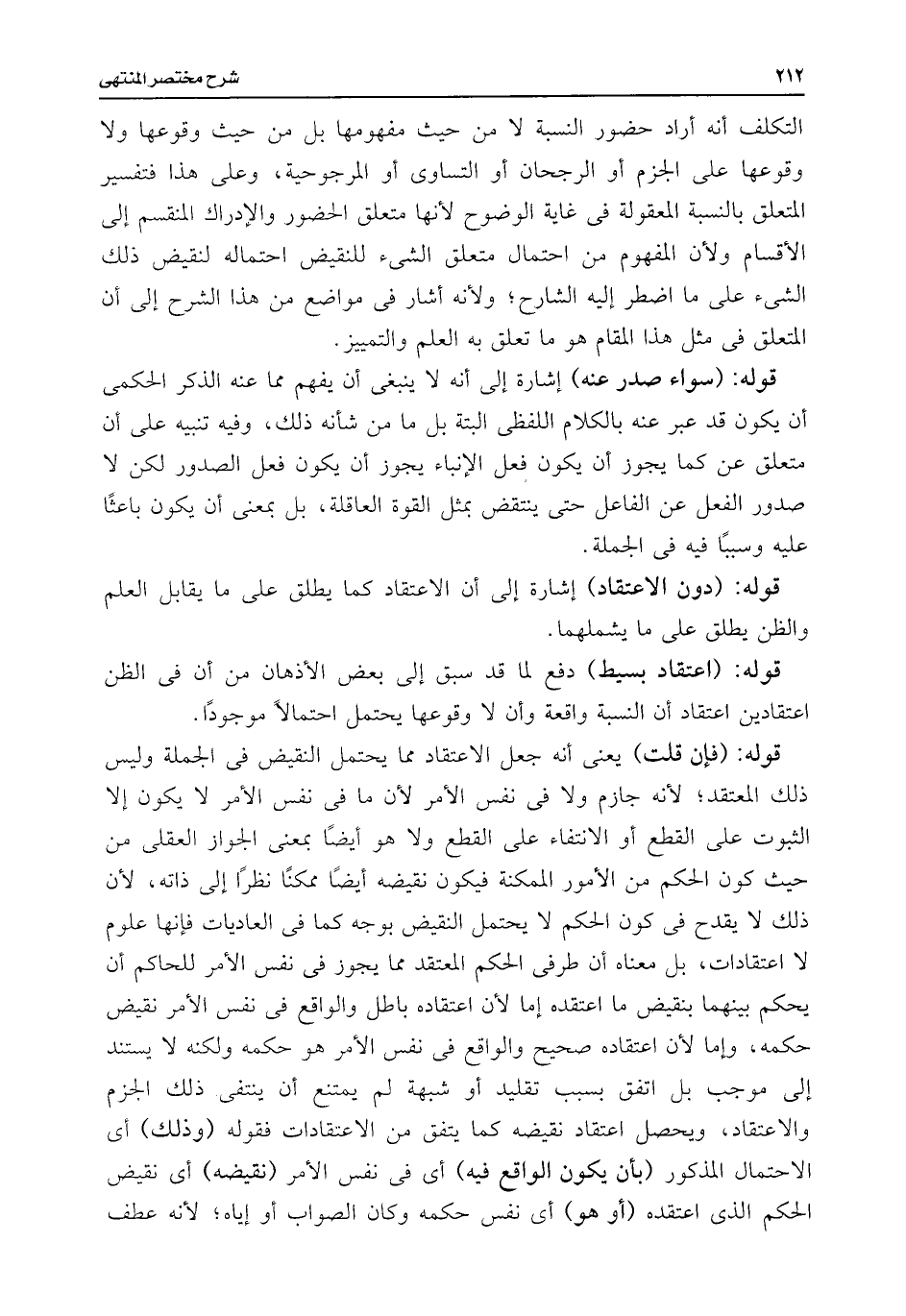 التكلف أنه أراد حضور النسبة لا من حيث مفهومها بل من حيث وقوعها ولا وقوعها على الجزم أو الرجحان أو التساوى أو المرجوحية، وعلى هذا فتفسير المتعلق بالنسبة المعقولة فى غاية الوضوح لأنها متعلق الحضور والإدراك المنقسم إلى الأقسام ولأن المفهوم من احتمال متعلق الشئ للنقيض احتماله لنقيض ذلك الشئ على ما اضطر إليه الشارح؛ ولأنه أشار فى مواضع من هذا الشرح إلى أن المتعلق فى مثل هذا المقام هو ما تعلق به العلم والتمييز.
