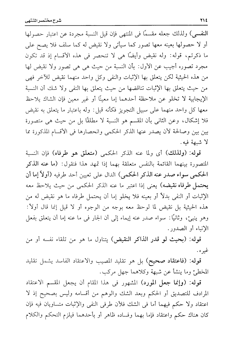 النفسى) ولذلك جعله مقسمًا فى المنتهى فإن قيل النسبة مجردة عن اعتبار حصولها أو لا حصولها بعينه معها تصور كما سيأتى ولا نقيض له بها سلف فلا يصح على ما ذكرتم، قوله: وله نقيض وأيضًا هى لا تنحصر فى هذه الأقسام إذ قد تكون مجرد تصوره أجيب عن الأول: بأن النسبة من حيث هى هى تصور ولا نقيض لها من هذه الحيثية لكن يتعلق بها الإثبات والنفى وكل واحد منهما نقيض للآخر فهى من حيث يتعلق بها الإثبات تناقضها من حيث يتعلق بها النفى ولا شك أن النسبة الإيجابية لا تخلو عن ملاحظة أحدهما إما معينًا أو غير معين فإن الشاك يلاحظ معها كل واحد منهما على سبيل التجويز فكأنه قيل: وله باعتبار ما يتعلق به نقيض فلا إشكال، وعن الثانى بأن المقسم هو النسبة لا مطلقًا بل من حيث هى متصورة بين بين وصالحة لأن يصدر عنها الذكر الحكمى وانحصارها فى الأقسام المذكورة مما لا شبهة فيه.
