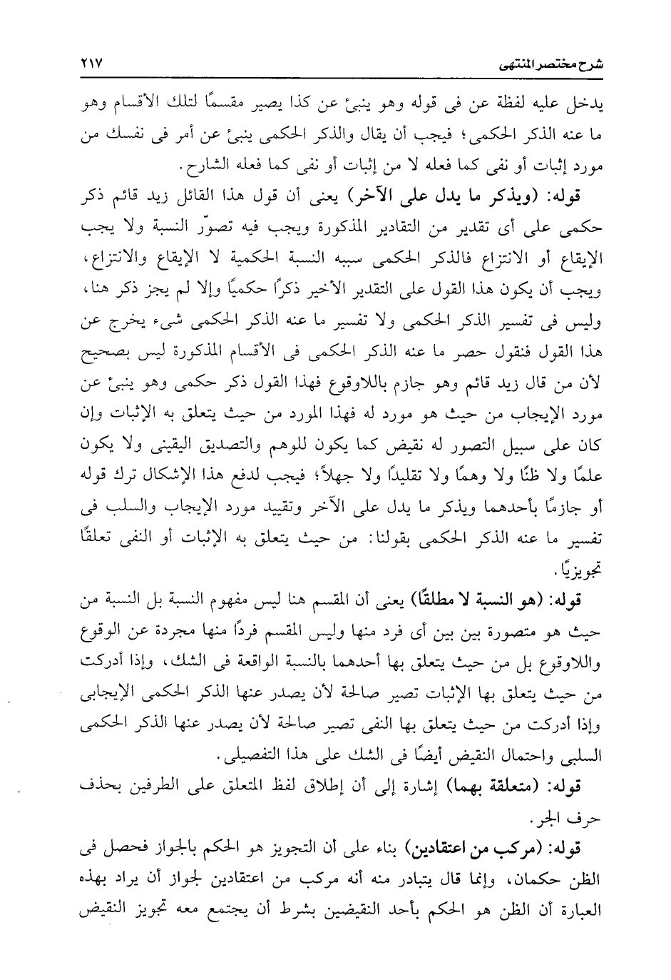 قوله: (ويذكر مما يدل على الآخر) يعنى أن قول هذا القائل زيد قائم ذكر حكمى على أى تقدير من التقادير المذكورة ويجب فيه تصوّر النسبة ولا يجب الإيقاع أو الانتزاع فالذكر الحكمى سببه النسبة الحكمية لا الإيقاع والانتزاع، ويجب أن يكون هذا القول على التقدير الأخير ذكرًا حكميًا وإلا لم يجز ذكر هنا، وليس فى تفسير الذكر الحكمى ولا تفسير ما عنه الذكر الحكمى شئ يخرج عن هذا القول فنقول حصر ما عنه الذكر الحكمى فى الأقسام المذكورة ليس بصحيح لأن من قال زيد قائم وهو جازم باللاوقوع فهذا القول ذكر حكمى وهو ينبئ عن مورد الإيجاب من حيث هو مورد له فهذا المورد من حيث يتعلق به الإثبات وإن كان على سبيل التصور له نقيض كما يكون للوهم والتصديق اليقينى ولا يكون علمًا ولا ظنًا ولا وهمًا ولا تقليدًا ولا جهلًا؛ فيجب لدفع هذا الإشكال ترك قوله أو جازمًا بأحدهما ويذكر ما يدل على الآخر وتقييد مورد الإيجاب والسلب فى تفسير ما عنه الذكر الحكمى بقولنا: من حيث يتعلق به الإثبات أو النفى تعلقًا تجويزيًا.