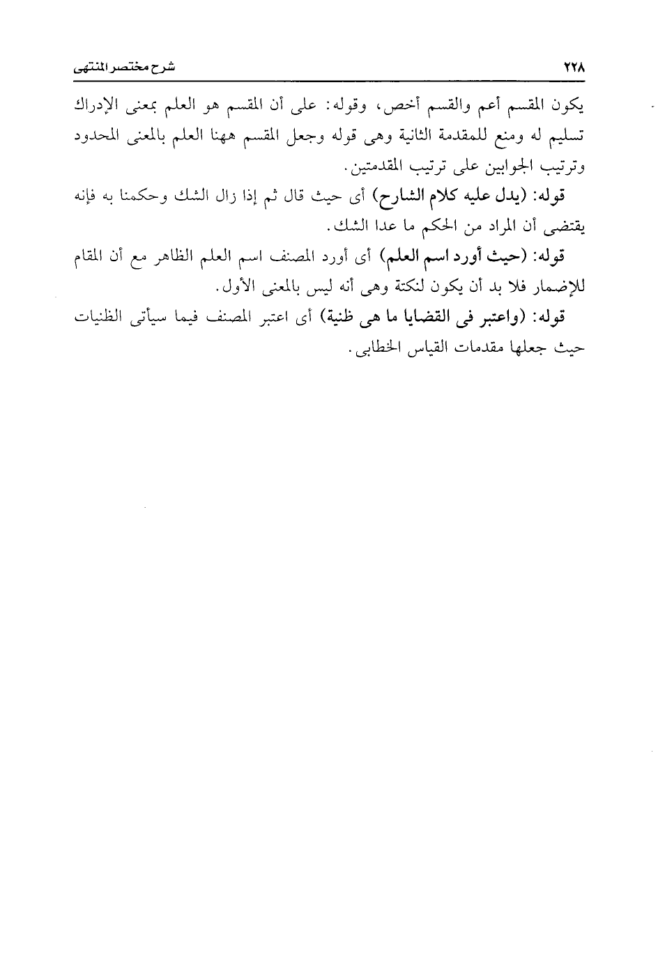 يكون المقسم أعم والقسم أخص، وقوله: على أن المقسم هو العلم بمعنى الإدراك تسليم له ومنع للمقدسة الثانية وهى قوله وجعل القسم ههنا العلم بالمعنى المحدود وترتيب الجوابين على ترتيب المقدمتين.