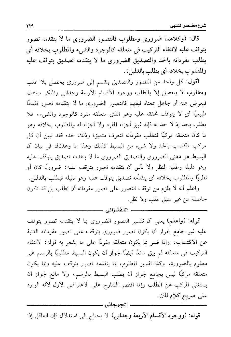 أقول: كل واحد من التصور والتصديق ينقسم إلى ضرورى يحصل بلا طلب ومطلوب لا يحصل إلا بالطلب ووجود الأقسام الأربعة وجدانى والمنكر مباهت فيعرض عنه أو جاهل بمعناه فيفهم فالتصور الضرورى ما لا يتقدمه تصور تقدمًا طبيعيًا أى لا يتوقف تحققه عليه وهو الذى متعلقه مفرد كالوجود والشئ، فلا يطلب بحد إذ لا حد له فإنه تمييز أجزاء المفرد ولا أجزاء له والمطلوب بخلافه وهو ما كان متعلقه مركبًا فتطلب مفرداته لتعرف متميزة وذلك حده فقد تبين أن كل مركب مكتسب بالحد ولا شئ من البسيط كذلك وهذا ما وعدناك فى بيان أن البسيط هو معنى الضرورى والتصديق الضرورى ما لا يتقدمه تصديق يتوقف عليه وهو دليله وطلبه النظر ولا بأس أن يتقدمه تصور يتوقف عليه: ضروريًا كان أو نظريًا والمطلوب بخلافه أى يتقدّمه تصديق يتوقف عليه وهو دليله فيطلب بالدليل.