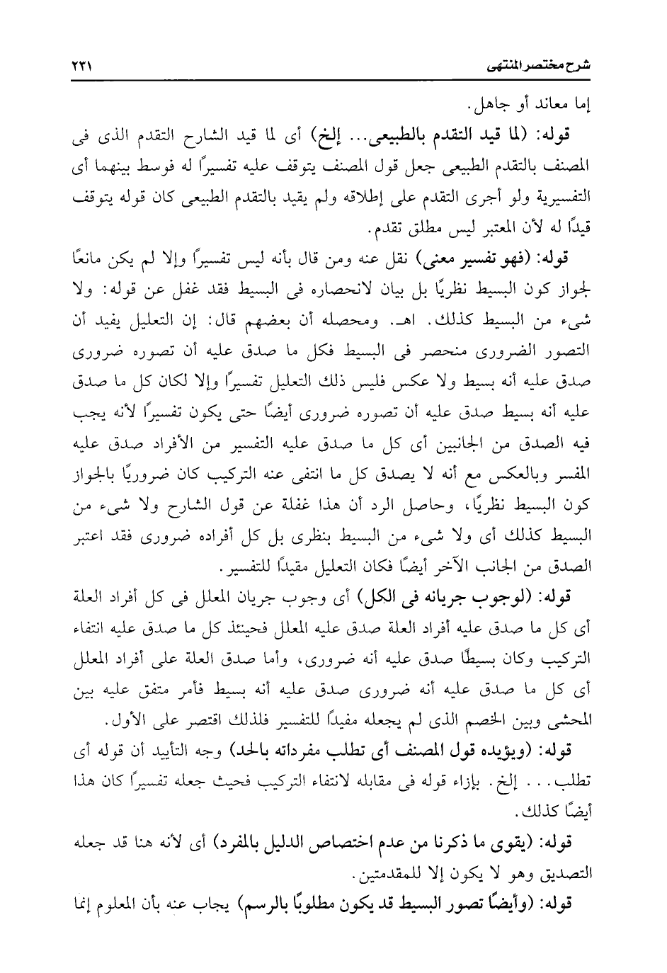 قوله: (لما قيد المتقدم بالطبيعى. . . إلخ) أى لما قيد الشارح المتقدم الذى فى المصنف بالتقدم الطبيعى جعل قول المصنف يتوقف عليه تفسيرًا له فوسط بينهما أى التفسيرية ولو أجرى المتقدم على إطلاقه ولم يقيد بالتقدم الطبيعى كان قوله يتوقف قيدًا له لأن المعتبر ليس مطلق تقدم.