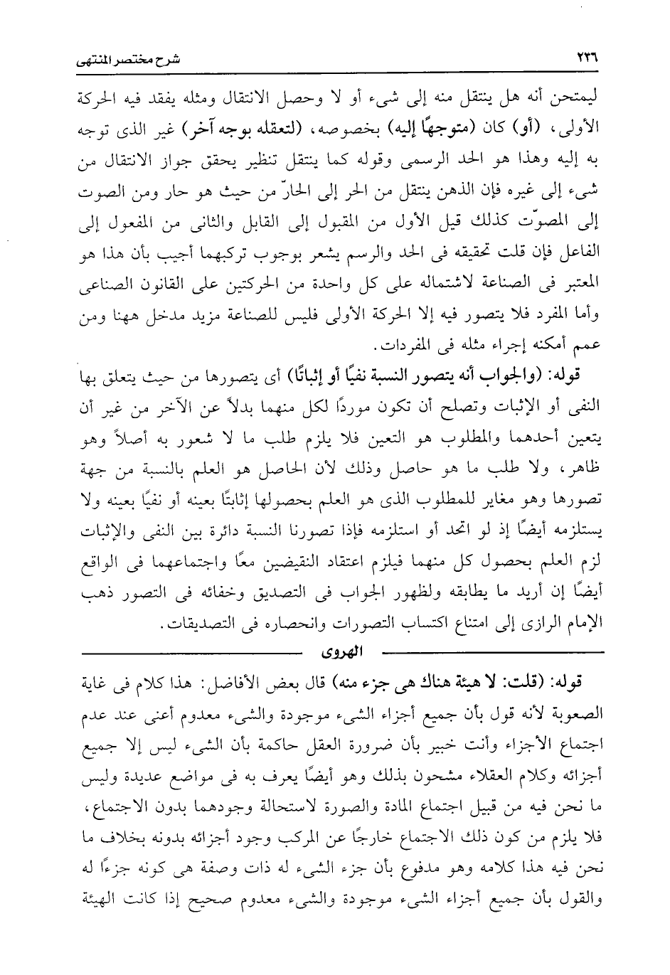 قوله: (قلت: لا هيئة هناك هى جزء منه) قال بعض الأفاضل: هذا كلام فى غاية الصعوبة لأنه قول بأن جميع أجزاء الشئ موجودة والشئ معدوم أعنى عند عدم اجتماع الأجزاء وأنت خبير بأن ضرورة العقل حاكمة بأن الشئ ليس إلا جميع أجزائه وكلام العقلاء مشحون بذلك وهو أيضًا يعرف به فى مواضع عديدة وليس ما نحن فيه من قبيل اجتماع المادة والصورة لاستحالة وجودهما بدون الاجتماع، فلا يلزم من كون ذلك الاجتماع خارجًا عن المركب وجود أجزائه بدونه بخلاف ما نحن فيه هذا كلامه وهو مدفوع بأن جزء الشئ له ذات وصفة هى كونه جزءًا له والقول بأن جميع أجزاء الشئ موجودة والشئ معدوم صحيح إذا كانت الهيئة