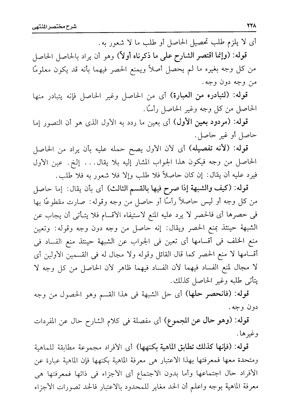 قوله: (وإنما اقتصر الشارح على ما ذكرناه أولًا) وهو أن يراد بالحاصل الحاصل من كل وجه بغيره ما لم يحصل أصلًا ويمنع الحصر فيهما بأنه قد يكون معلومًا من وجه دون وجه.