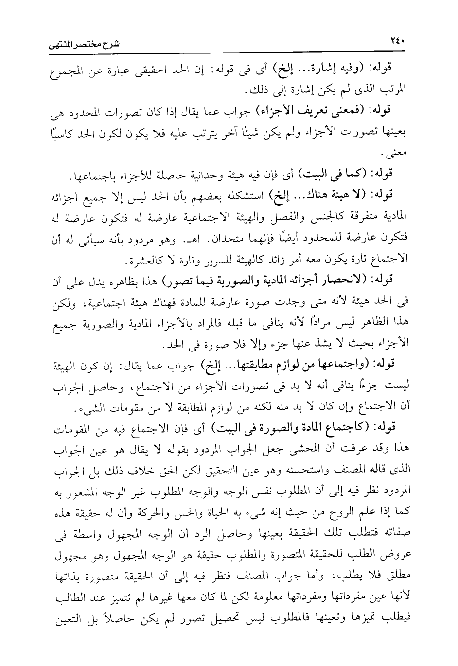 قوله: (لانحصار أجزائه المادية والصورية فيما تصور) هذا بظاهره يدل على أن فى الحد هيئة لأنه متى وجدت صورة عارضة للمادة فهناك هيئة اجتماعية، ولكن هذا الظاهر ليس مرادًا لأنه ينافى ما قبله فالمراد بالأجزاء المادية والصورية جميع الأجزاء بحيث لا يشذ عنها جزء وإلا فلا صورة فى الحد.