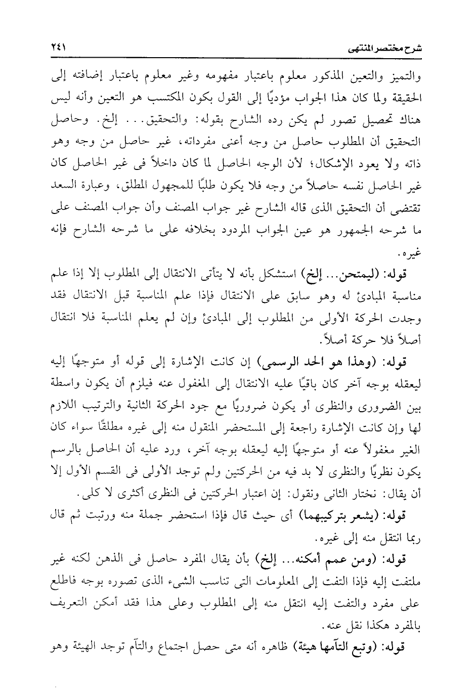 قوله: (وهذا هو الحد الرسمى) إن كانت الإشارة إلى قوله أو متوجهًا إليه ليعقله بوجه آخر كان باقيًا عليه الانتقال إلى المغفول عنه فيلزم أن يكون واسطة بين الضرورى والنظرى أو يكون ضروريًا مع جود الحركة الثانية والترتيب اللازم لها وإن كانت الإشارة راجعة إلى المستحضر المنقول منه إلى غيره مطلقًا سواء كان الغير مغفولًا عنه أو متوجهًا إليه ليعقله بوجه آخر، ورد عليه أن الحاصل بالرسم يكون نظريًا والنظرى لا بد فيه من الحركتين ولم توجد الأولى فى القسم الأول إلا أن يقال: نختار الثانى ونقول: إن اعتبار الحركتين فى النظرى أكثرى لا كلى.