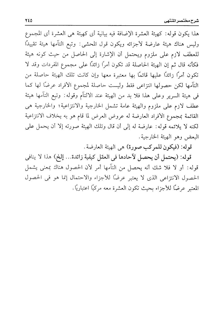 قوله: (يحتمل أن يحصل لآحادها فى العقل كيفية زائدة. . . إلخ) هذا لا ينافى قوله: أو لا فلا شك أنه يحصل من التآمها أمر لأن الحصول هناك بمعنى يشمل الحصول الانتزاعى الذى لا يعتبر عرضًا للأجزاء والاحتمال إنما هو فى الحصول المعتبر عرضًا للأجزاء بحيث تكون العشرة معه مركبًا اعتباريًا.
