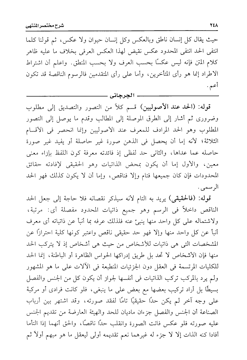 حيث يقال كل إنسان ناطق وبالعكس وكل إنسان حيوان ولا عكس، ثم قولنا كلما انتفى الحد انتفى المحدود عكس نقيض لهذا العكس العرفى بخلاف ما عليه ظاهر كلام المتن فإنه ليس عكسًا بحسب العرف ولا بحسب المنطق. واعلم أن اشتراط الاطراد إنما هو رأى المتأخرين، وأما على رأى المتقدمين فالرسوم الناقصة قد تكون أعم.