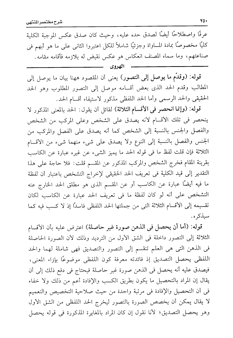 قوله: (وإنما انحصر فى الأقسام الثلاثة) لقائل أن يقول: الحد بالمعنى المذكور لا ينحصر فى تلك الأقسام لأنه يصدق على الشخص وعلى المركب من الشخص والفصل والجنس بالنسبة إلى الشخص كما أنه يصدق على الفصل والمركب من الجنس والفصل بالنسبة إلى النوع ولا يصدق على شئ منهما شئ من الأقسام الثلاثة فإن قلت لفظ ما فى قوله الحد ما يميز الشئ عن غيره عبارة عن الكاسب بقرينة المقام فخرج الشخص والمركب المذكور عن المقسم قلت: فلا حاجة على هذا التقدير إلى قيد الكلية فى تعريف الحد الحقيقى لإخراج التشخص باعتبار أن لفظة ما فيه أيضًا عبارة عن الكاسب أو عن المقسم الذى هو مطلق الحد الخارج عنه التشخص على أنه لو كان لفظة ما فى تعريف الحد عبارة عن الكاسب لكان تقسيمه إلى الأقسام الثلاثة التى من جملتها الحد اللفظى فاسدًا إذ لا كسب فيه كما سيذكره.