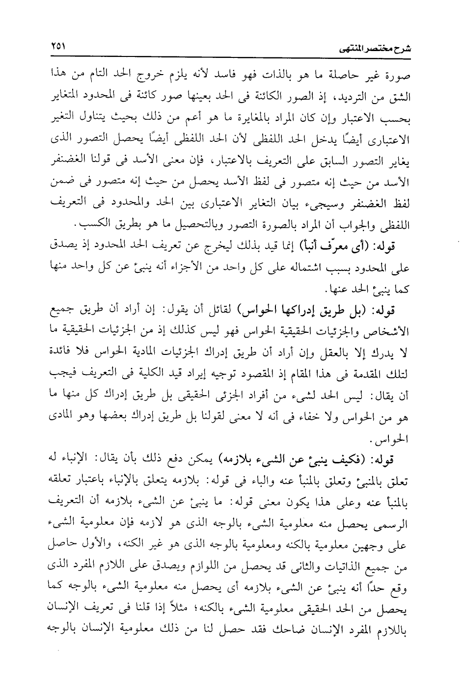 قوله: (فكيف ينبئ عن الشئ بلازمه) يمكن دفع ذلك بأن يقال: الإنباء له تعلق بالمنبئ وتعلق بالمنبأ عنه والباء فى قوله: بلازمه يتعلق بالإنباء باعتبار تعلقه بالمنبأ عنه وعلى هذا يكون معنى قوله: ما ينبئ عن الشئ بلازمه أن التعريف الرسمى يحصل منه معلومية الشئ بالوجه الذى هو لازمه فإن معلومية الشئ على وجهين معلومية بالكنه ومعلومية بالوجه الذى هو غير الكنه، والأول حاصل من جميع الذاتيات والثانى قد يحصل من اللوازم ويصدق على اللازم المفرد الذى وقع حدًا أنه ينبئ عن الشئ بلازمه أى يحصل منه معلومية الشئ بالوجه كما يحصل من الحد الحقيقى معلومية الشئ بالكنه؛ مثلًا إذا قلنا فى تعريف الإنسان باللازم المفرد الإنسان ضاحك فقد حصل لنا من ذلك معلومية الإنسان بالوجه