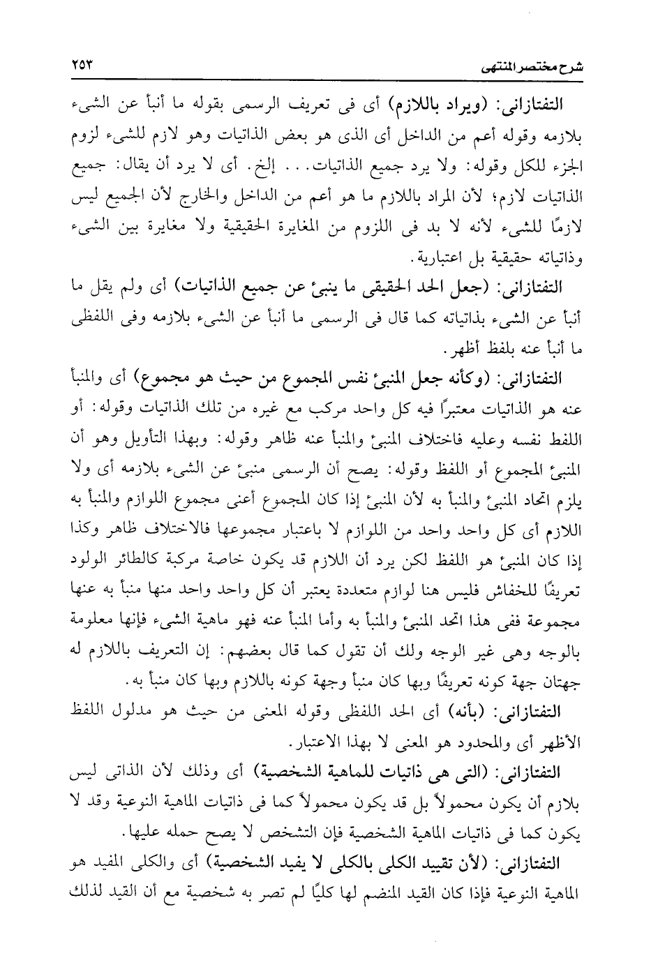 التفتازانى: (جعل الحد الحقيقى ما ينبئ عن جميع الذاتيات) أى ولم يقل ما أنبأ عن الشئ بذاتياته كما قال فى الرسمى ما أنبأ عن الشئ بلازمه وفي اللفظى ما أنبأ عنه بلفظ أظهر.