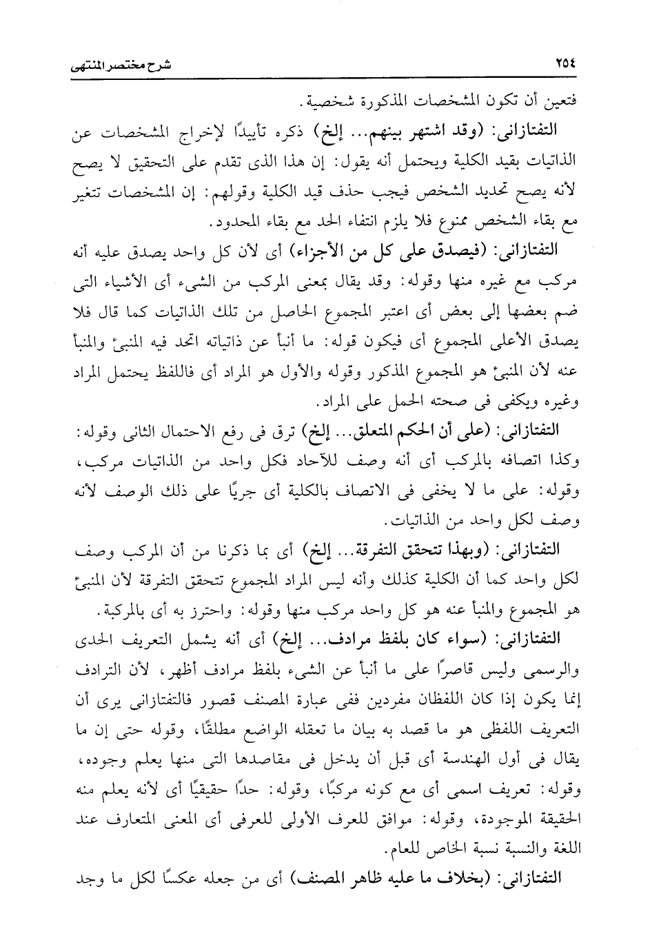 التفتازانى: (وقد اشتهر بينهم. . . إلخ) ذكره تأييدًا لإخراج المشخصات عن الذاتيات بقيد الكلية ويحتمل أنه يقول: إن هذا الذى تقدم على التحقيق لا يصح لأنه يصح تحديد الشخص فيجب حذف قيد الكلية وقولهم: إن المشخصات تتغير مع بقاء الشخص ممنوع فلا يلزم انتفاء الحد مع بقاء المحدود.