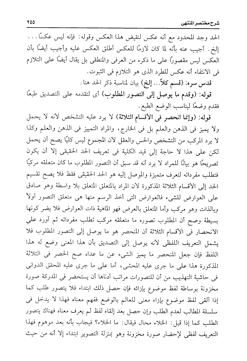 قوله: (وإنما انحصر فى الأقسام الثلاثة) لا يرد عليه التشخيص لأنه لا يحمل ولا يميز فى الذهن والعلم بل فى الخارج، والمراد التمييز فى الذهن والعلم وكذا لا يرد المركب من التشخص والحس والعقل لأن المجموع ليس كليًا يصح أن يحمل لكن على هذا لا حاجة إلى قيد الكلية فى تعريف الحد الحقيقى إلا أن يكون تصريحًا هو بيانًا للمراد لا يرد أنه قد سبق أن التهور المطلوب ما كان متعلقه مركبًا فتطلب مفرداته لتعرف متميزة والموصل إليه هو الحد الحقيقى فقط فلا يصح تقسيم الحد إلى الأقسام الثلاثة المذكورة لأن المراد بالمتعلق المتعلق بلا واسطة وهو صادق على العوارض للشئ فالعوارض التى أخذ الرسم منها هى متعلق التصور أولًا وبالذات وهو مركب وأما المتعلق بالعرض فهو الماهية ذات العوارض فلا يضر كونها بسيطة وصح أن المطلوب تصوره ما متعلقه مركب تطلب مفرداته ثم أورد على الانحصار فى الأقسام الثلاثة أن المنحصر هو ما يوصل إلى التهور المطلوب فلا يشمل التعريف اللفظى لأنه يوصل إلى التصديق بأن هذا المعنى وضع له هذا اللفظ فإن جعل المنحصر ما يميز الشئ عن ما عداه صح الحصر فى الثلاثة المذكورة هذا على ما جرى عليه المحشى، أما على ما جرى عليه المحقق الدوانى فى حاشية التهذيب من أن للتصورات مراتب أدناها أن يستحضر فى المدركة صورة مخزونة بوساطة لفظ موضوع بإزاء فإن حصل ذلك ابتداء فلا يتصور طلب كما إذا ألقى لفظ موضوع بإزاء معنى للعالم بالوضع ففهم معناه فهذا لا يدخل فى سلسلة المطالب لعدم الطلب وإن حصل بعد إلقاء لفظ لم يعرف معناه فهناك يتصور الطلب كما إذا قيل: الخلاء محال فيقال: ما الخلاء؟ فيجاب بأنه بعد موهوم فهذا التعريف لفظى لإحضار صورة مخزونة وهو بمنزلة التصوير ابتداء إلا أنه من حيث
