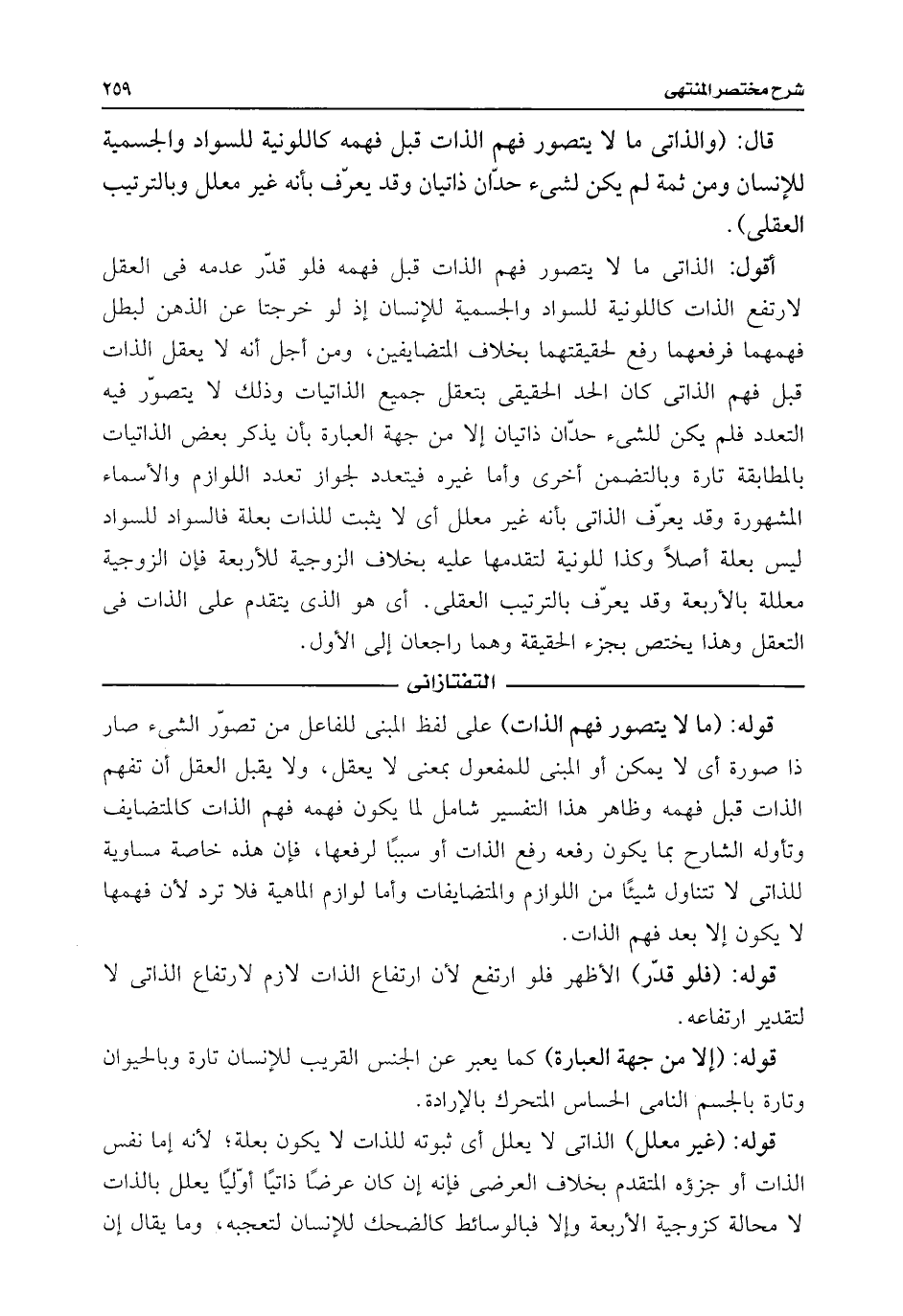 قال: (والذاتى ما لا يتصور فهم الذات قبل فهمه كاللونية للسواد والجسمية للإنسان ومن ثمة لم يكن لشئ حدّان ذاتيان وقد يعرف بأنه غير معلل وبالترتيب العقلى).