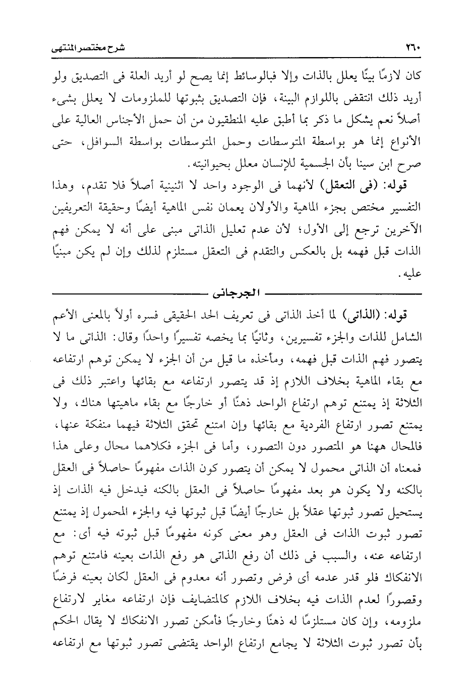 كان لازمًا بينًا يعلل بالذات وإلا فبالوسائط إنما يصح لو أريد العلة فى التصديق ولو أريد ذلك انتقض باللوازم البينة، فإن التصديق بثبوتها للملزومات لا يعلل بشئ أصلًا نعم يشكل ما ذكر بما أطبق عليه المنطقيون من أن حمل الأجناس العالية على الأنواع إنما هو بواسطة المتوسطات وحيل المتوسطات بواسطة السوافل، حتى صرح ابن سينا بأن الجسمية للإنسان معلل بحيوانيته.