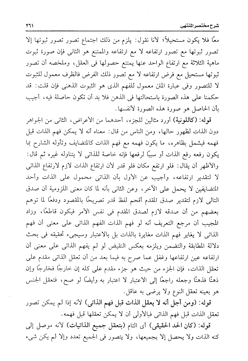 قوله: (كاللونية) أورد مثالين للجزء، أحدهما من الأعراض، الثانى من الجواهر دون الذات لظهور حالها، ومن الناس من قال: معناه أنه لا يمكن فهم الذات قبل فهمه فيشمل بظاهره، ما يكون فهمه مع فهم الذات كالمتضايف وتأوله الشارح بما يكون رفعه رفع الذات أو سببًا لرفعها فإنه خاصة للذاتى لا يتناوله غيره ثم قال: والأظهر أن يقال: فلو ارتفع مكان فلو قدر لأن ارتفاع الذات لازم لارتفاع الذاتى لا لتقدير ارتفاعه، وأجيب عن الأول بأن الذاتى محمول على الذات وأحد المتضايفين لا يحمل على الآخر، وعن الثانى بأنه لما كان معنى اللزومية أن صدق التالي لازم لتقدير صدق المقدم أقحم لفظ قدر تصريحًا بالمقصود ودفعًا لما توهم بعضهم من أن صدقه لازم لصدق المقدم فى نفس الأمر فيكون قاطعًا، وزاد المجيب أن مرجع التعريف أنه لو فهم الذات الفهم الذاتى على معنى أن فهم الذاتى لا يغاير فهم الذات مغايرة بالذات بل بالاعتبار وسيجئ تحقيقه فى بحث دلالة المطابقة والتضمن ويلزمه بعكس النقيض لم يفهم الذاتى على معنى أن ارتفاعه عين ارتفاعها وغفل عما صرح به فيما بعد من أن تعقل الذاتى مقدم على تعقل الذات، فإن الجزء من حيث هو جزء مقدم على كله إن خارجًا فخارجًا وإن ذهنًا فذهنًا وجعله راجعًا إلى الاعتبار لا اعتبار به وأيضًا لو صح، فتعقل الجنس هو بعينه تعقل النوع ولا يرضى به عاقل.