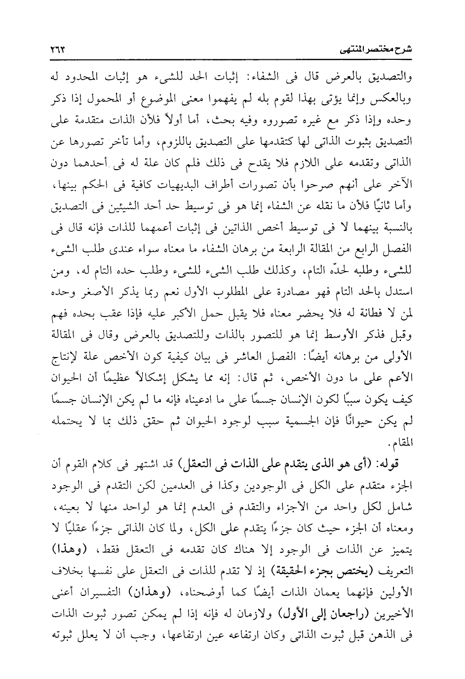 والتصديق بالعرض قال فى الشفاء: إثبات الحد للشئ هو إثبات المحدود له وبالعكس وإنما يؤتى بهذا لقوم بله لم يفهموا معنى الموضوع أو المحمول إذا ذكر وحده وإذا ذكره غيره تصوروه وفيه بحث، أما أولًا فلأن الذات متقدمة على التصديق بثبوت الذاتى لها كتقدمها على التصديق باللزوم، وأما تأخر تصورها عن الذاتى وتقدمه على اللازم فلا يقدح فى ذلك فلم كان علة له فى أحدهما دون الآخر على أنهم صرحوا بأن تصورات أطراف البديهيات كافية فى الحكم بينها، وأما ثانيًا فلأن ما نقله عن الشفاء إنما هو فى توسيط حد أحد الشيئين فى التصديق بالنسبة بينهما لا فى توسيط أخص الذاتين فى إثبات أعمهما للذات فإنه قال فى الفصل الرابع من المقالة الرابعة من برهان الشفاء ما معناه سواء عندي طلب الشئ للشئ وطلبه لحده التام، وكذلك طلب الشئ للشئ وطلب حده التام له، ومن استدل بالحد التام فهو مصادرة على المطلوب الأول نعم ربما يذكر الأصغر وحده لمن لا فطانة له فلا يحضر معناه فلا يقبل حمل الأكبر عليه فإذا عقب بحده فهم وقبل فذكر الأوسط إنما هو للتصور بالذات وللتصديق بالعرض وقال فى المقالة الأولى من برهانه أيضًا: الفصل العاشر فى بيان كيفكية كون الأخص علة لإنتاج الأعم على ما دون الأخص، ثم قال: إنه مما يشكل إشكالًا عظيمًا أن الحيوان كيف يكون سببًا لكون الإنسان جسمًا على ما ادعيناه فإنه ما لم يكن الإنسان جسمًا لم يكن حيوانًا فإن الجسمية سبب لوجود الحيوان ثم حقق ذلك بما لا يحتمله المقام.