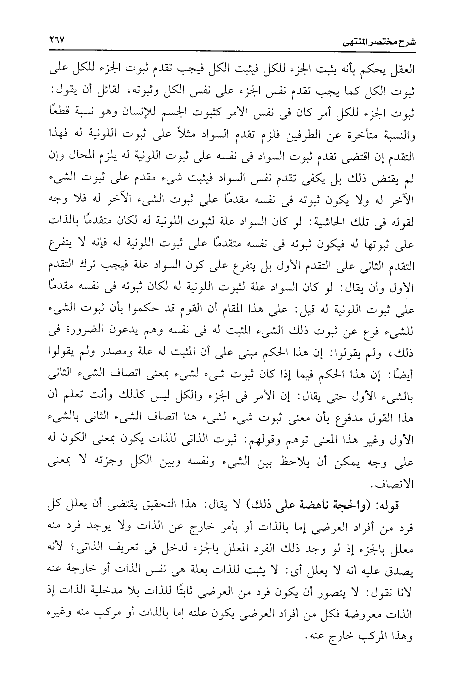 العقل يحكم بأنه يثبت الجزء للكل فيثبت الكل فيجب تقدم ثبوت الجزء للكل على ثبوت الكل كما يجب تقدم نفس الجزء على نفس الكل وتبوته، لقائل أن يقول: ثبوت الجزء للكل أمر كان فى نفس الأمر كثبوت الجسم للإنسان وهو نسبة قطعًا والنسبة متأخرة عن الطرفين فلزم تقدم السواد مثلًا على ثبوت اللونية له فهذا التقدم إن اقتضى تقدم ثبوت السواد فى نفسه على ثبوت اللونية له يلزم الحال وإن لم يقتض ذلك بل يكفى تقدم نفس السواد فيثبت شئ مقدم على ثبوت الشئ الآخر له ولا يكون ثبوته فى نفسه مقدمًا على ثبوت الشئ الآخر له فلا وجه لقوله فى تلك الحاشية: لو كان السواد علة لثبوت اللونية له لكان متقدمًا بالذات على ثبوتها له فيكون ثبوته فى نفسه متقدمًا على ثبوت اللونية له فإنه لا يتفرع التقدم الثانى على التقدم الأول بل يتفرع على كون السواد علة فيجب ترك التقدم الأول وأن يقال: لو كان السواد علة لثبوت اللونية له لكان ثبوته فى نفسه مقدمًا على ثبوت اللونية له قيل: على هذا المقام أن القوم قد حكموا بأن ثبوت الشئ للشئ فرع عن ثبوت ذلك الشئ المثبت له فى نفسه وهم يدعون الضرورة فى ذلك، ولم يقولوا: إن هذا الحكم مبنى على أن المثبت له علة ومصدر ولم يقولوا أيضًا: إن هذا الحكم فيما إذا كان ثبوت شئ لشئ بمعنى اتصاف الشئ الثانى بالشئ الأول حتى يقال: إن الأمر فى الجزء والكل ليس كذلك وأنت تعلم أن هذا القول مدفوع بأن معنى ثبوت شئ لشئ هنا اتصاف الشئ الثانى بالشئ الأول وغير هذا المعنى توهم وقولهم: ثبوت الذاتى للذات يكون بمعنى الكون له على وجه يمكن أن يلاحظ بين الشئ ونفسه وبين الكل وجزئه لا بمعنى الاتصاف.