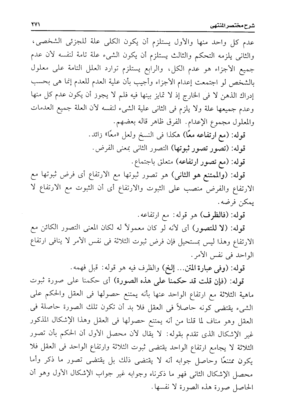 عدم كل واحد منها والأول يستلزم أن يكون الكلى علة للجزئى الشخصى، والثانى يلزمه التحكم والثالث يستلزم أن يكون الشئ علة تامة لنفسه لأن عدم جميع الأجزاء هو عدم الكل، والرابع يستلزم توارد العلل التامة على معلول بالشخص لو اجتمعت إعدام الأجزاء وأجيب بأن عليه العدم للعدم إنما هى بحسب إدراك الذهن لا فى الخارج إذ لا تمايز بينها فيه فلم لا يجوز أن يكون عدم كل منها وعدم جميعها علة ولا يلزم فى الثانى عليه الشئ لنفسه لأن العلة جميع العدمات والمعلول مجموع الإعدام. الفرق ظاهر قاله بعضهم.