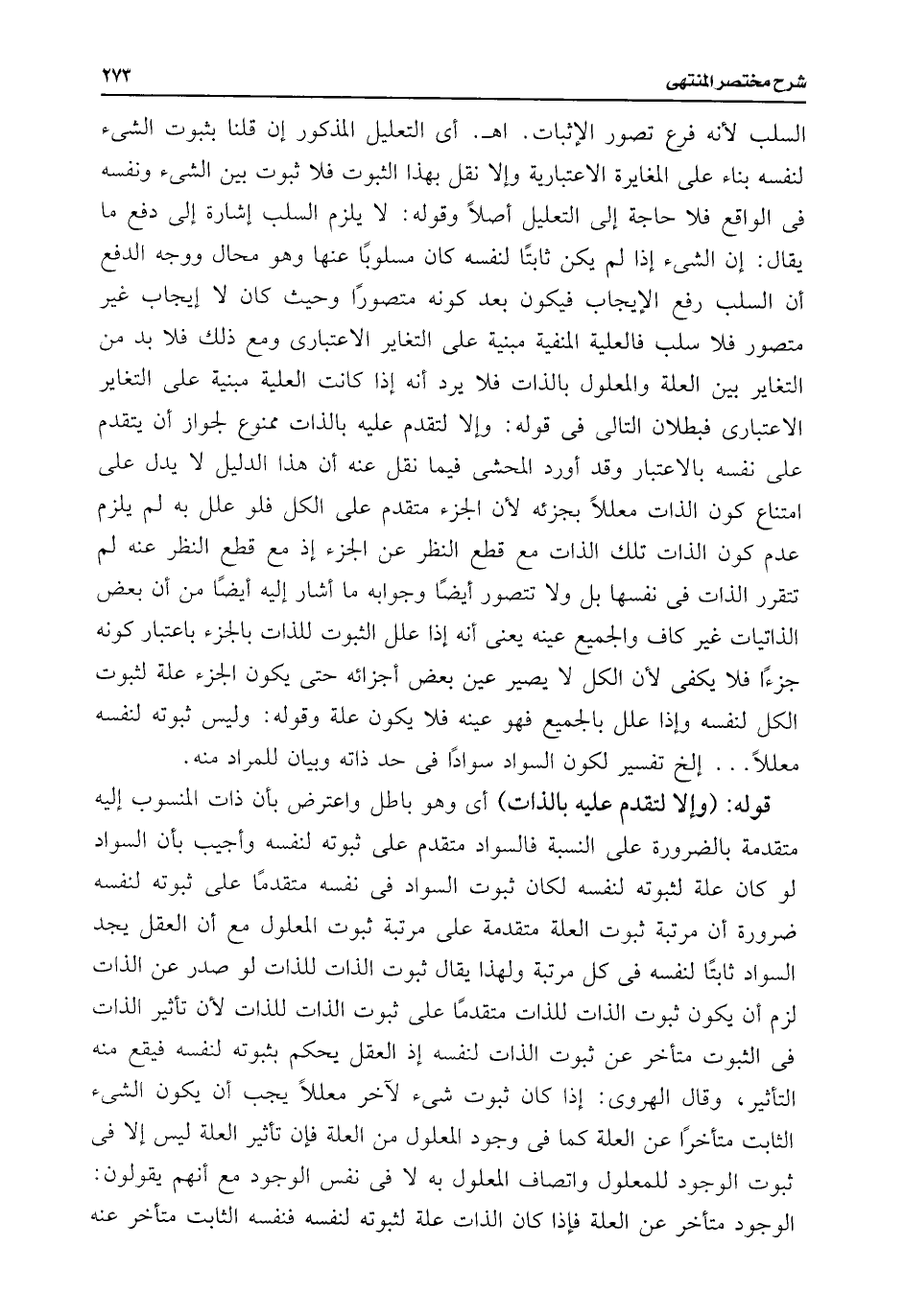 السلب لأنه فرع تصور الإثبات. اهـ. أى التعليل المذكور إن قلنا بثبوت الشئ لنفسه بناء على المغايرة الاعتبارية وإلا نقل بهذا الثبوت فلا ثبوت بين الشئ ونفسه فى الواقع فلا حاجة إلى التعليل أصلًا وقوله: لا يلزم السلب إشارة إلى دفع ما يقال: إن الشئ إذا لم يكن ثابتًا لنفسه كان مسلوبًا عنها وهو محال ووجه الدفع أن السلب رفع الإيجاب فيكون بعد كونه متصورًا وحيث كان لا إيجاب غير متصور فلا سلب فالعلية المنفية مبنية على التغاير الاعتبارى ومع ذلك فلا بد من التغاير بين العلة والمعلول بالذات فلا يرد أنه إذا كانت العلية مبنية على التغاير الاعتبارى فبطلان التالى فى قوله: وإلا لتقدم عليه بالذات ممنوع لجواز أن يتقدم على نفسه بالاعتبار وقد أورد المحشى فيما نقل عنه أن هذا الدليل لا يدل على امتناع كون الذات معللًا بجزئه لأن الجزء متقدم على الكل فلو علل به لم يلزم عدم كون الذات تلك الذات مع قطع النظر عن الجزء إذ مع قطع النظر عنه لم تتقرر الذات فى نفسها بل ولا تتصور أيضًا وجوابه ما أشار إليه أيضًا من أن بعض الذاتيات غير كاف والجميع عينه يعنى أنه إذا علل الثبوت للذات بالجزء باعتبار كونه جزءًا فلا يكفى لأن الكل لا يصير عين بعض أجزائه حتى يكون الجزء علة لثبوت الكل لنفسه وإذا علل بالجميع فهو عينه فلا يكون علة وقوله: وليس ثبوته لنفسه معللًا. . . إلخ تفسير لكون فالسواد سوادًا فى حد ذاته وبيان للمراد منه.