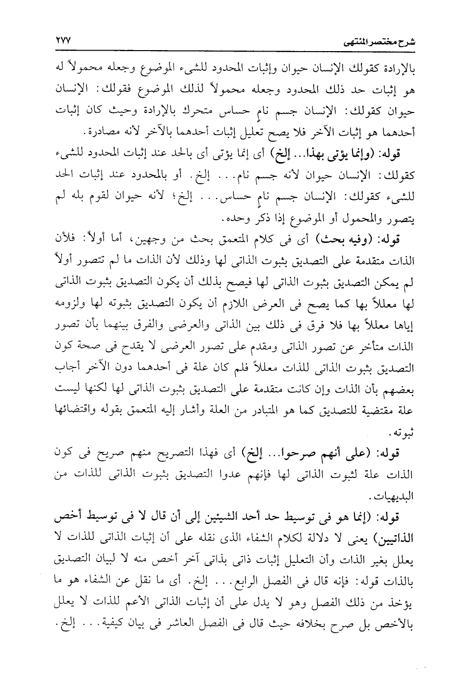 بالإرادة كقولك الإنسان حيوان وإثبات المحدود للشئ الموضوع وجعله محمولًا له هو إثبات حد ذلك المحدود وجعله محمولًا لذلك الموضوع فقولك: الإنسان حيوان كقولك: الإنسان جسم نامٍ حساس متحرك بالإرادة وحيث كان إثبات أحدهما هو إثبات الآخر فلا يصح تعليل إثبات أحدهما بالآخر لأنه مصادرة.