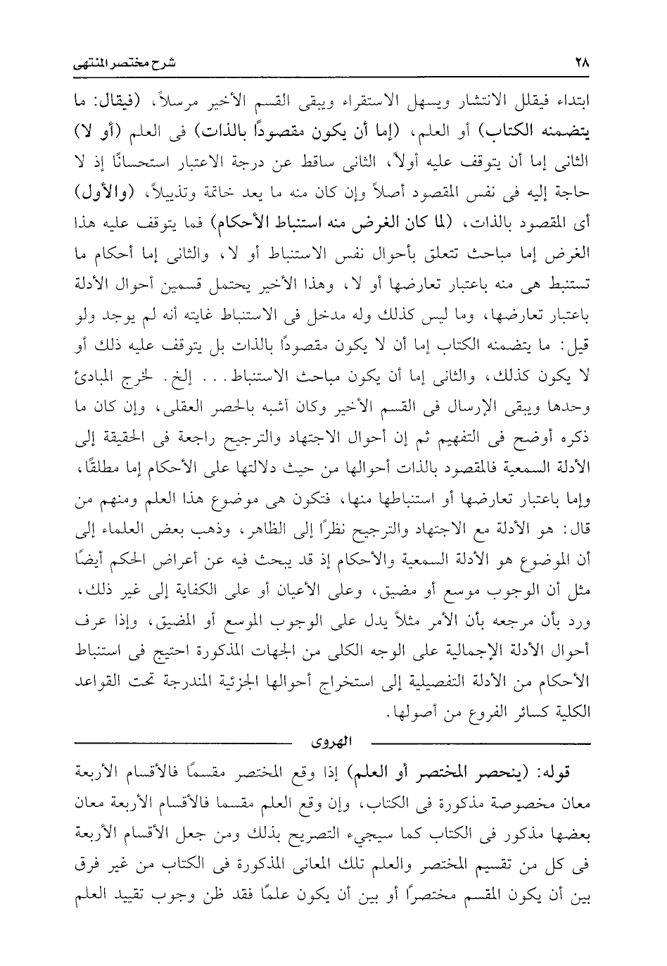 ابتداء فيقلل الانتشار ويسهل الاستقراء ويبقى القسم الأخير مرسلًا، (فيقال: ما يتضمنه الكتاب) أو العلم، (إما أن يكون مقصودًا بالذات) فى العلم (أو لا) الثاني إما أن يتوقف عليه أولًا، الثاني ساقط عن درجة الاعتبار استحسانًا إذ لا حاجة إليه فى نفس المقصود أصلًا وإن كان منه ما يعد خاتمة وتذييلًا، (والأول) أى المقصود بالذات، (لما كان الغرض منه استنباط الأحكام) فما يتوقف عليه هذا الغرض إما مباحث تتعلق بأحوال نفس الاستنباط أو لا، والثاني إما أحكام ما تستنبط هي منه باعتبار تعارضها أو لا، وهذا الأخير يحتمل قسمين أحوال الأدلة باعتبار تعارضها، وما ليس كذلك وله مدخل فى الاستنباط غايته أنه لم يوجد ولو قيل: ما يتضمنه الكتاب إما أن لا يكون مقصودًا بالذات بل يتوقف عليه ذلك أو لا يكون كذلك، والثاني إما أن يكون مباحث الاستنباط. . . إلخ. لخرج المبادئ وحدها ويبقى الإرسال فى القسم الأخير وكان أشبه بالحصر العقلى، وإن كان بها ذكره أوضح فى التفهيم ثم إن أحوال الاجتهاد والترجيح راجعة فى الحقيقة إلى الأدلة السمعية فالمقصود بالذات أحوالها من حيث دلالتها على الأحكام إما مطلقًا، وإما باعتبار تعارضها أو استنباطها منها، فتكون هى موضوع هذا العلم ومنهم من قال: هو الأدلة مع الاجتهاد والترجيح نظرًا إلى الظاهر، وذهب بعض العلماء إلى أن الموضوع هو الأدلة السمعية والأحكام إذ قد يبحث فيه عن أعراض الحكم أيضًا مثل أن الوجوب موسع أو مضيق، وعلى الأعيان أو على الكفاية إلى غير ذلك، ورد بأن مرجعه بأن الأمر مثلًا يدل على الوجوب الموسع أو المضيق، وإذا عرف أحوال الأدلة الإجمالية على الوجه الكلى من الجهات المذكورة احتيج فى استنباط الأحكام من الأدلة التفصيلية إلى استخراج أحوالها الجزئية المندرجة تحت القواعد الكلية كسائر الفروع من أصولها.