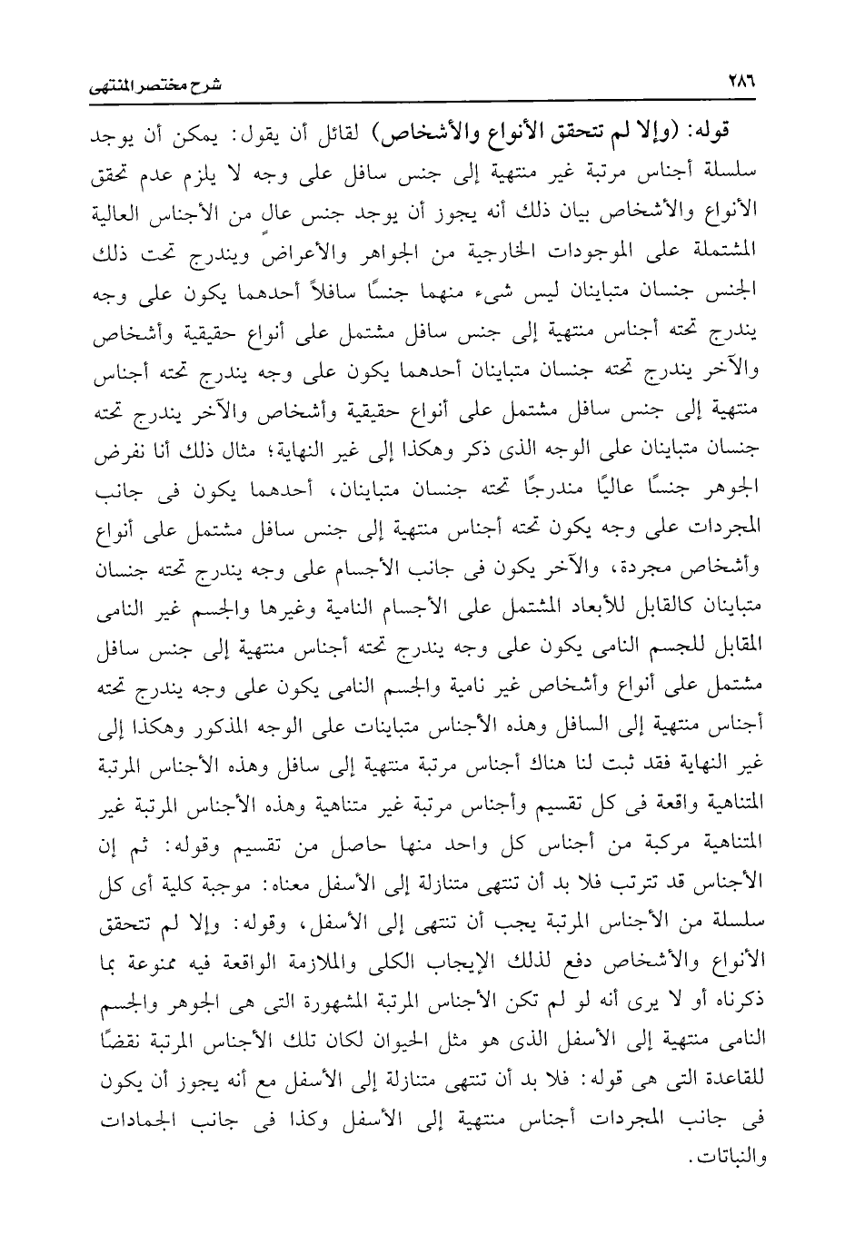 قوله: (وإلا لم تتحقق الأنواع والأشخاص) لقائل أن يقول: يمكن أن يوجد سلسلة أجناس مرتبة غير منتهية إلى جنس سافل على وجه لا يلزم عدم تحقق الأنواع والأشخاص بيان ذلك أنه يجوز أن يوجد جنس عالٍ من الأجناس العالية المشتملة على الموجودات الخارجية من الجواهر والأعراض ويندرج تحت ذلك الجنس جنسان متباينان ليس شئ منهما جنسًا سافلًا أحدهما يكون على وجه يندرج تحته أجناس منتهية إلى جنس سافل مشتمل على أنواع حقيقية وأشخاص والآخر يندرج تحته جنسان متباينان أحدهما يكون على وجه يندرج تحته أجناس منتهية إلى جنس سافل مشتمل على أنواع حقيقية وأشخاص والآخر يندرج تحته جنسان متباينان على الوجه الذى ذكر وهكذا إلى غير النهاية؛ مثال ذلك أنا نفرض الجوهر جنسًا عاليًا مندرجًا تحته جنسان متباينان، أحدهما يكون فى جانب المجردات على وجه يكون تحته أجناس منتهية إلى جنس سافل مشتمل على أنواع وأشخاص مجردة، والآخر يكون فى جانب الأجسام على وجه يندرج تحته جنسان متباينان كالقابل للأبعاد المشتمل على الأجسام النامية وغيرها والجسم غير النامى المقابل للجسم النامى يكون على وجه يندرج تحته أجناس منتهية إلى جنس سافل مشتمل على أنواع وأشخاص غير نامية والجسم النامى يكون على وجه يندرج تحته أجناس منتهية إلى السافل وهذه الأجناس متباينات على الوجه المذكور وهكذا إلى غير النهاية فقد ثبت لنا هناك أجناس مرتبة منتهية إلى سافل وهذه الأجناس المرتبة المتناهية واقعة فى كل تقسيم وأجناس مرتبة غير متناهية وهذه الأجناس المرتبة غير المتناهية مركبة من أجناس كل واحد منها حاصل من تقسيم وقوله: ثم إن الأجناس قد تترتب فلا بد أن تنتهى متنازلة إلى الأسفل معناه: موجبة كلية أى كل سلسلة من الأجناس المرتبة يجب أن تنتهى إلى الأسفل، وقوله: وإلا لم تتحقق الأنواع والأشخاص دفع لذلك الإيجاب الكلى والملازمة الواقعة فيه ممنوعة بما ذكرناه أو لا يرى أنه لو لم تكن الأجناس المرتبة المشهورة التى هى الجوهر والجسم النامى منتهية إلى الأسفل الذى هو مثل الحيوان لكان تلك الأجناس المرتبة نقضًا للقاعدة التى هى قوله: فلا بد أن تنتهى متنازلة إلى الأسفل فإنه يجوز أن يكون فى جانب المجردات أجناس منتهية إلى الأسفل وكذا فى جانب الجمادات والنباتات.