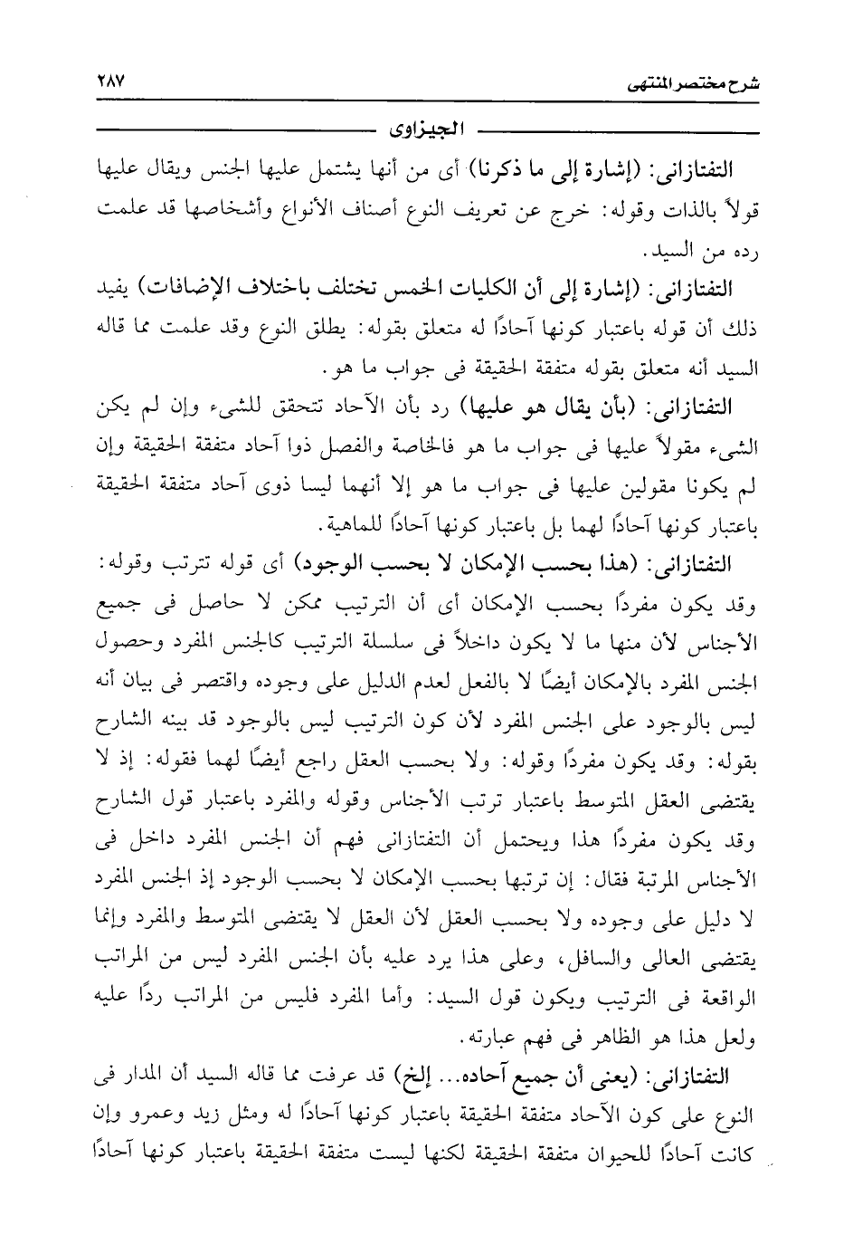 التفتازانى: (بأن يقال هو عليها) رد بأن الآحاد تتحقق للشئ كما وإن لم يكن الشئ مقولًا عليها فى جواب ما هو فالخاصة والفصل ذوا آحاد متفقة الحقيقة وإن لم يكونا مقولين عليها فى جواب ما هو إلا أنهما ليسا ذوى آحاد متفقة الحقيقة باعتبار كونها آحادًا لهما بل باعتبار كونها آحادًا للماهية.