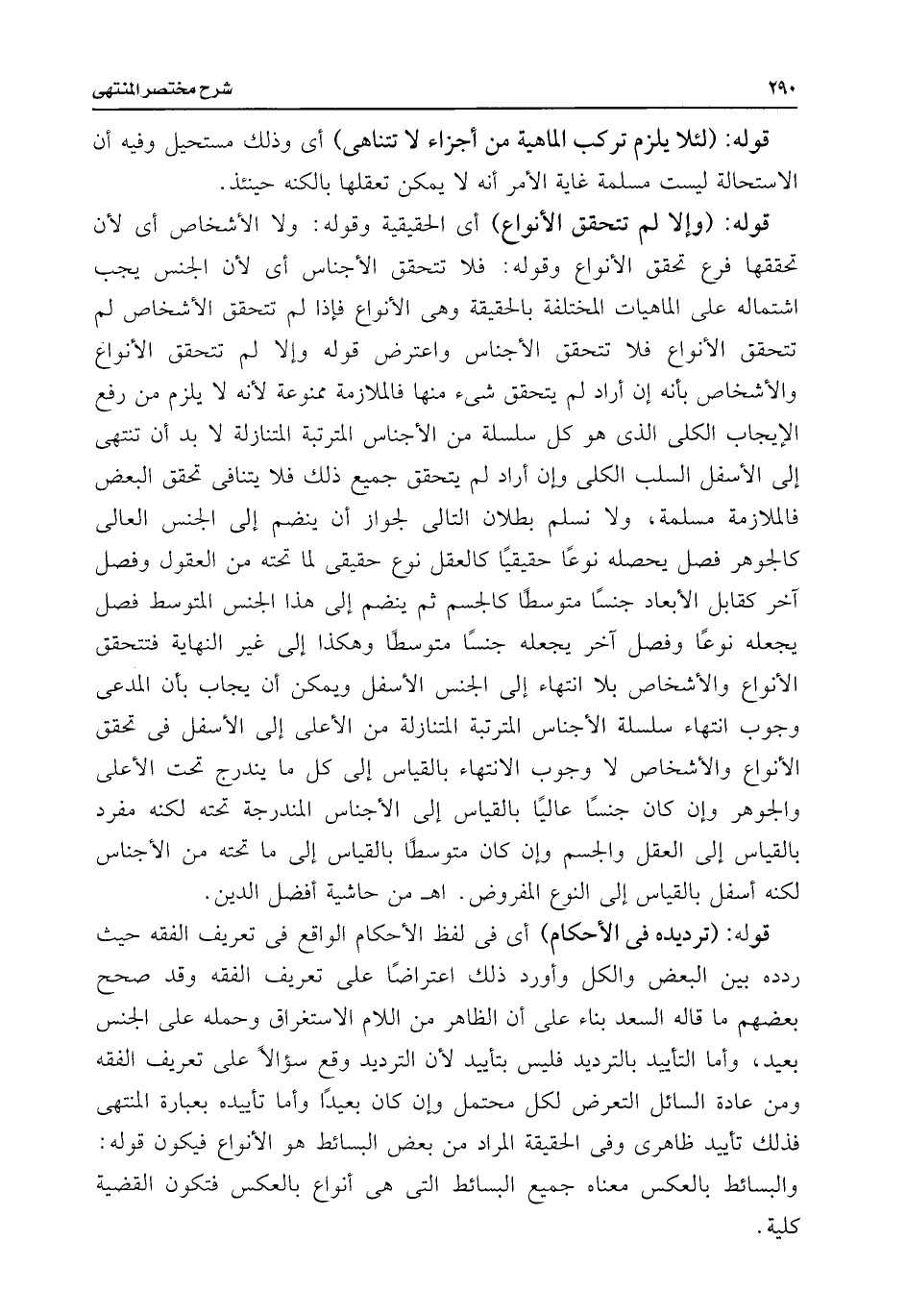 قوله: (وإلا لم تتحتقق الأنواع) أى الحقيقية وقوله: ولا الأشخاص أى لأن تحققها فرع تحقق الأنواع وقوله: فلا تتحقق الأجناس أى لأن الجنس يجب اشتماله على الماهيات المختلفة بالحقيقة وهى الأنواع فإذا لم تتحقق الأشخاص لم تتحقق الأنواع فلا تتحقق الأجناس واعترض قوله وإلا لم تتحقق الأنواع والأشخاص بأنه إن أراد لم يتحقق شئ منها فالملازمة ممنوعة لأنه لا يلزم من رفع الإيجاب الكلى الذى هو كل سلسلة من الأجناس المترتبة المتنازلة لا بد أن تنتهى إلى الأسفل السلب الكلى وإن أراد لم يتحقق جميع ذلك فلا يتنافى تحقق البعض فالملازمة مسلمة، ولا نسلم بطلان التالى لجواز أن ينضم إلى الجنس العالى كالجوهر فصل يحصله نوعًا حقيقيًا كالعقل نوع حقيقى لما تحته من العقول وفصل آخر كقابل الأبعاد جنسًا متوسطًا كالجسم ثم ينضم إلى هذا الجنس المتوسط فصل يجعله نوعًا وفصل آخر يجعله جنسًا متوسطًا وهكذا إلى غير النهاية فتتحقق الأنواع والأشخاص بلا انتهاء إلى الجنس الأسفل ويمكن أن يجاب بأن المدعى وجوب انتهاء سلسلة الأجناس المترتبة المتنازلة من الأعلى إلى الأسفل فى تحقق الأنواع والأشخاص لا وجوب الانتهاء بالقياس إلى كل ما يندرج تحت الأعلى والجوهر وإن كان جنسًا عاليًا بالقياس إلى الأجناس المندرجة تحته لكنه مفرد بالقياس إلى العقل والجسم وإن كان متوسطًا بالقياس إلى ما تحته من الأجناس لكنه أسفل بالقياس إلى النوع المفروض. اهـ من حاشية أفضل الدين.