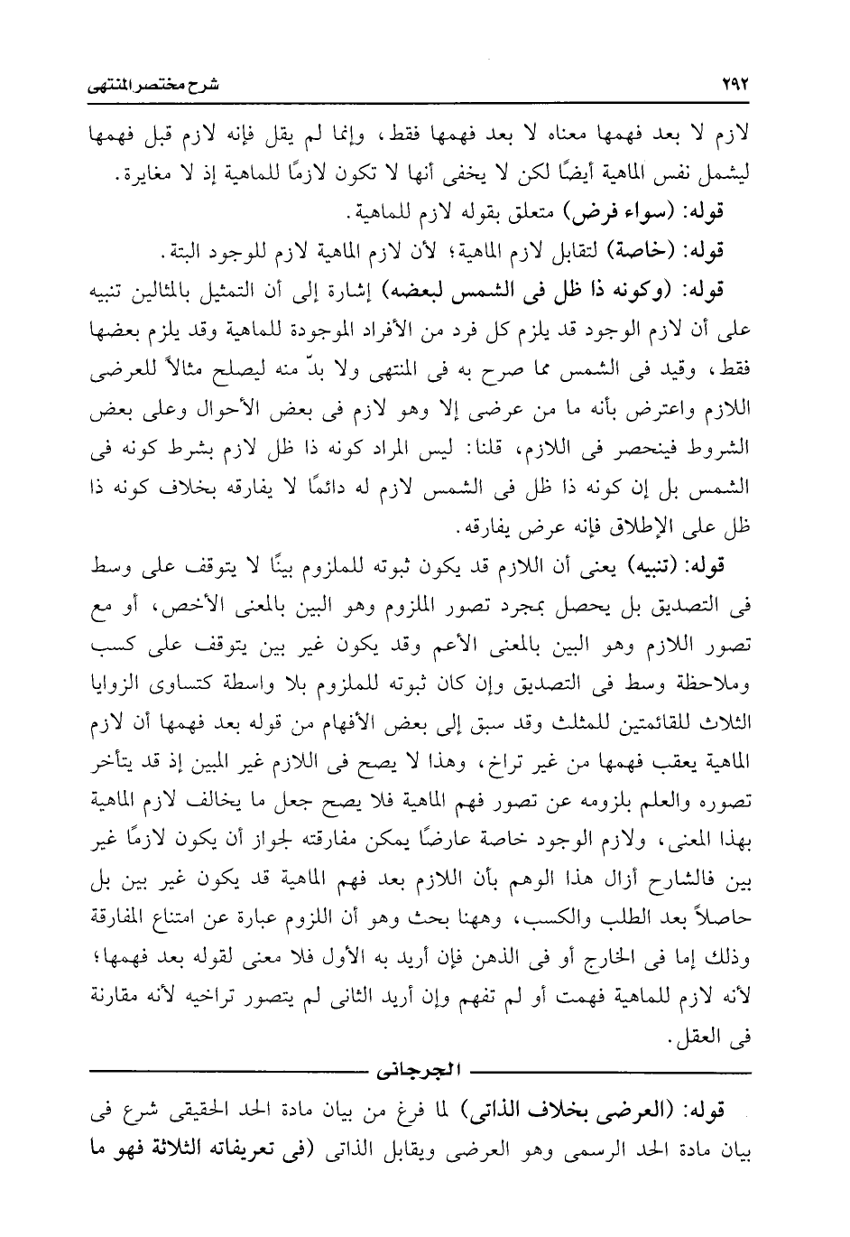قوله: (وكونه ذا ظل فى الشمس لبعضه) إشارة إلى أن التمثيل بالمثالين تنبيه على أن لازم الوجود قد يلزم كل فرد من الأفراد الوجودة للماهية وقد يلزم بعضها فقط، وقيد فى الشمس مما صرح به فى المنتهى ولا بد منه ليصلح مثالًا للعرضى اللازم واعترض بأنه ما من عرضى إلا وهو لازم فى بعض الأحوال وعلى بعض الشروط فينحصر فى اللازم، قلنا: ليس المراد كونه ذا ظل لازم بشرط كونه فى الشمس بل إن كونه ذا ظل فى الشمس لازم له دائمًا لا يفارقه بخلاف كونه ذا ظل على الإطلاق فإنه عرض يفارقه.