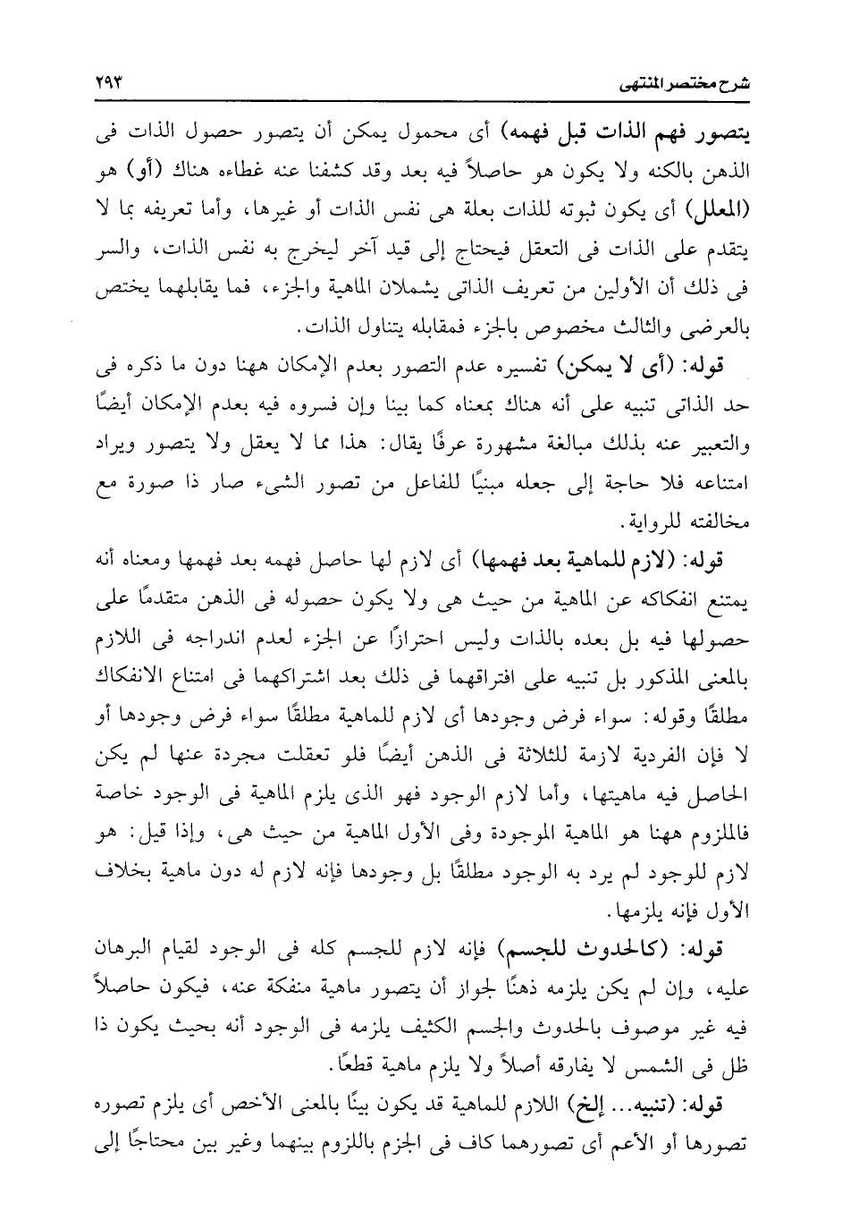 قوله: (كالحدوث للجسم) فإنه لازم للجسم كله فى الوجود لقيام البرهان عليه، وإن لم يكن يلزمه ذهنًا لجواز أن يتصور ماهية منفكة عنه، فيكون حاصلًا فيه غير موصوف بالحدوث والجسم الكثيف يلزمه فى الوجود أنه بحيث يكون ذا ظل فى الشمس لا يفارفه أصلًا ولا يلزم ماهية قطعًا.