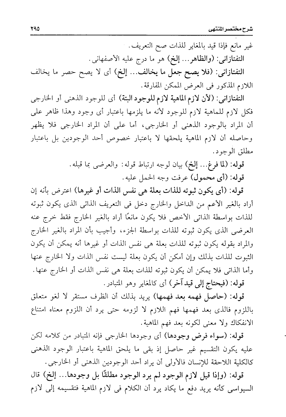التفتازانى: (لأن لازم الماهية لازم للوجود البتة) أى للوجود الذهنى أو الخارجى فكل لازم للماهية لازم للوجود لأنه ما يلزمها باعتبار أى وجود وهذا ظاهر على أن المراد بالوجود الذهنى أو الخارجى، أما على أن المراد الخارجى فلا يظهر وحاصله أن لازم الماهية يلحقها لا باعتبار خصوص أحد الوجودين بل باعتبار مطلق الوجود.
