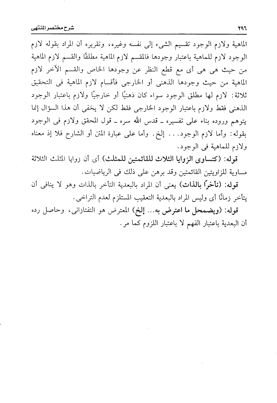 الماهية ولازم الوجود تقسيم الشئ إلى نفسه وغيره، وتقريره أن المراد بقوله لازم الوجود لازم للماهية باعتبار وجودها فالمقسم لازم الماهية مطلقًا والقسم لازم الماهية من حيث هى هى أى مع قطع النظر عن وجودها الخاص والقسم الآخر لازم الماهية من حيث وجودها الذهنى أو الخارجى فأقسام لازم الماهية فى التحقيق ثلاثة: لازم لها مطلق الوجود سواء كان ذهنيًا أو خارجيًا ولازم باعتبار الوجود الذهنى فقط ولازم باعتبار الوجود الخارجى فقط لكن لا يخفى أن هذا السؤال إنما يتوهم وروده بناء على تفسيره -قدس اللَّه سره- قول المحقق ولازم فى الوجود بقوله: وأما لازم الوجود. . . إلخ. وأما على عبارة المتن أو الشارح فلا إذ معناه ولازم للماهية فى الوجود.