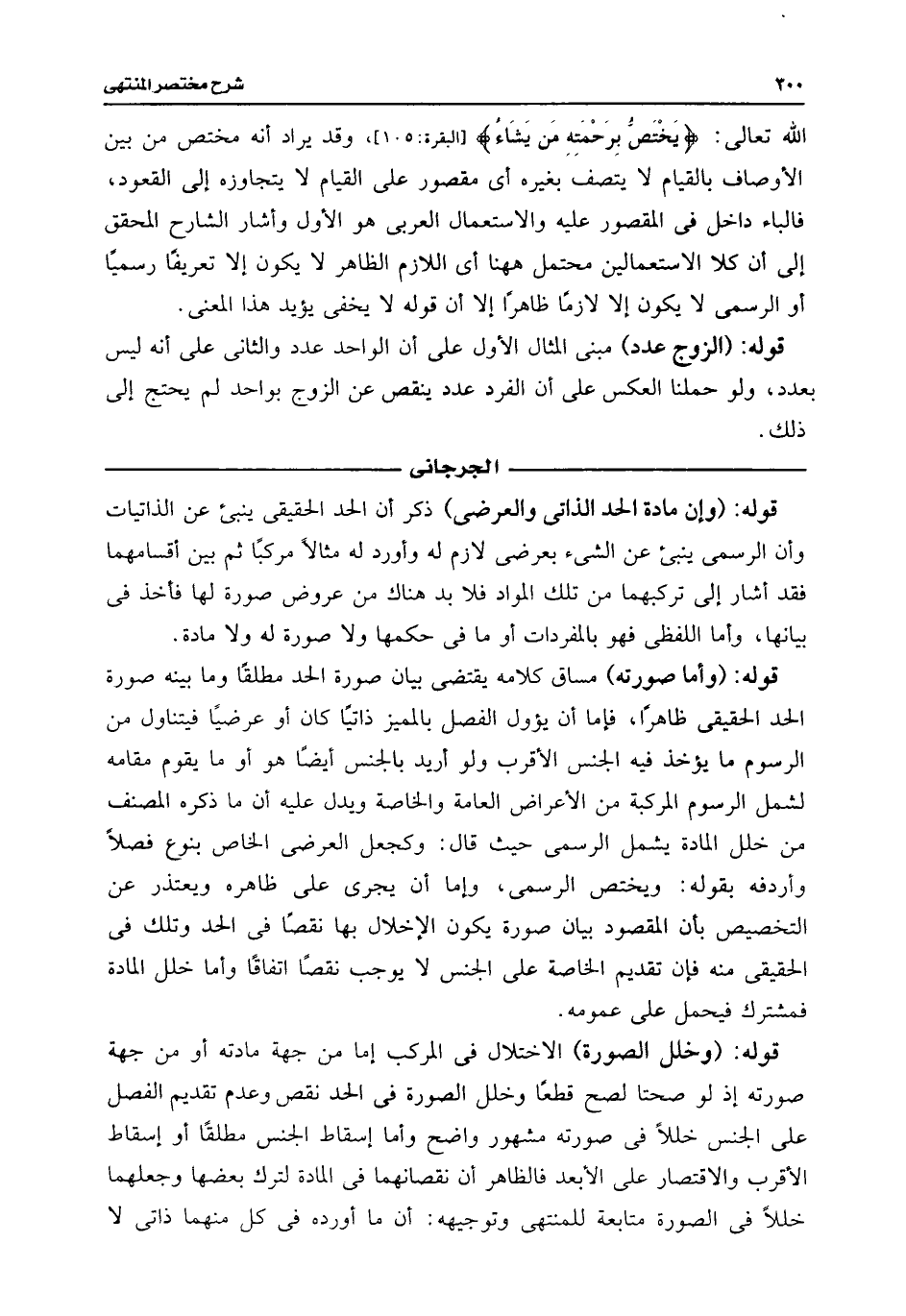 اللَّه تعالى: {يَخْتَصُّ بِرَحْمَتِهِ مَنْ يَشَاءُ} [البقرة: ١٠٥] وقد يراد أنه مختص من بين الأوصاف بالقيام لا يتصف بغيره أى مقصور على القيام لا يتجاوزه إلى القعود، فالباء داخل فى المقصور عليه والاستعمال العربي هو الأول وأشار الشارح المحقق إلى أن كلا الاستعمالين محتمل ههنا أى اللازم الظاهر لا يكون إلا تعريفًا رسميًا أو الرسمى لا يكون إلا لازمًا ظاهرًا إلا أن قوله لا يخفى يؤيد هذا المعنى.