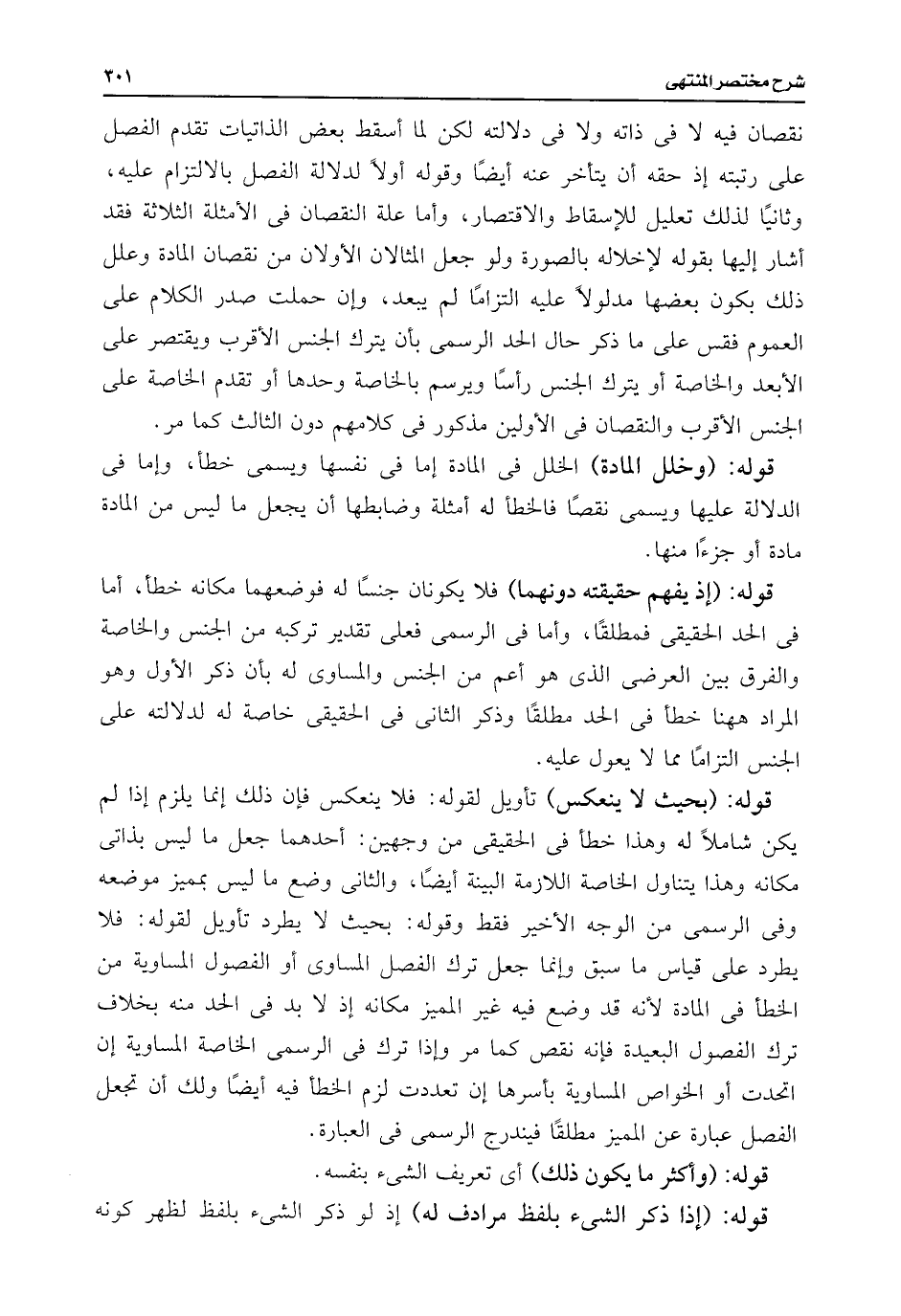 نقصان فيه لا فى ذاته ولا فى دلالته لكن لما أسقط بعض الذاتيات تقدم الفصل على رتبته إذ حقه أن يتأخر عنه أيضًا وقوله أولًا لدلالة الفصل بالالتزام عليه، وثانيًا لذلك تعليل للإسقاط والاقتصار، وأما علة النقصان فى الأمثلة الثلاثة فقد أشار إليها بقوله لإخلاله بالصورة ولو جعل المثالان الأولان من نقصان المادة وعلل ذلك بكون بعضها مدلولًا عليه التزامًا لم يبعد، وإن حملت صدر الكلام على العموم فقس على ما ذكر حال الحد الرسمى بأن يترك الجنس الأقرب ويقتصر على الأبعد والخاصة أو يترك الجنس رأسًا ويرسم بالخاصة وحدها أو تقدم الخاصة على الجنس الأقرب والنقصان فى الأولين مذكور فى كلامهم دون الثالث كما مر.