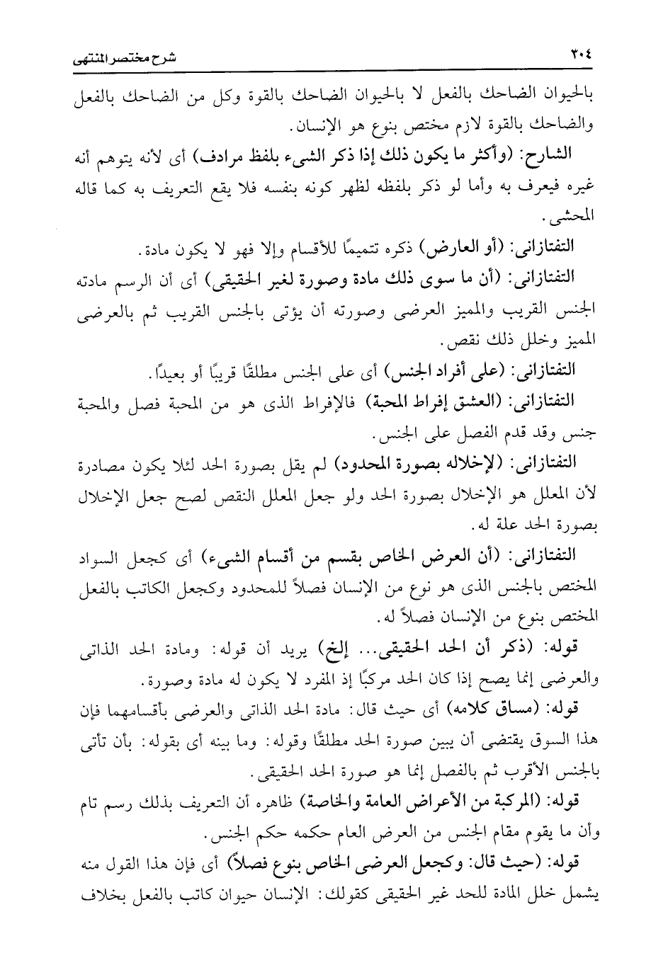 التفتازانى: (أن ما سوى ذلك مادة وصورة لغير الحقيقى) أى أن الرسم مادته الجنس القريب والمميز العرضى وصورته أن يؤتى بالجنس القريب ثم بالعرضى المميز وخلل ذلك نقص.