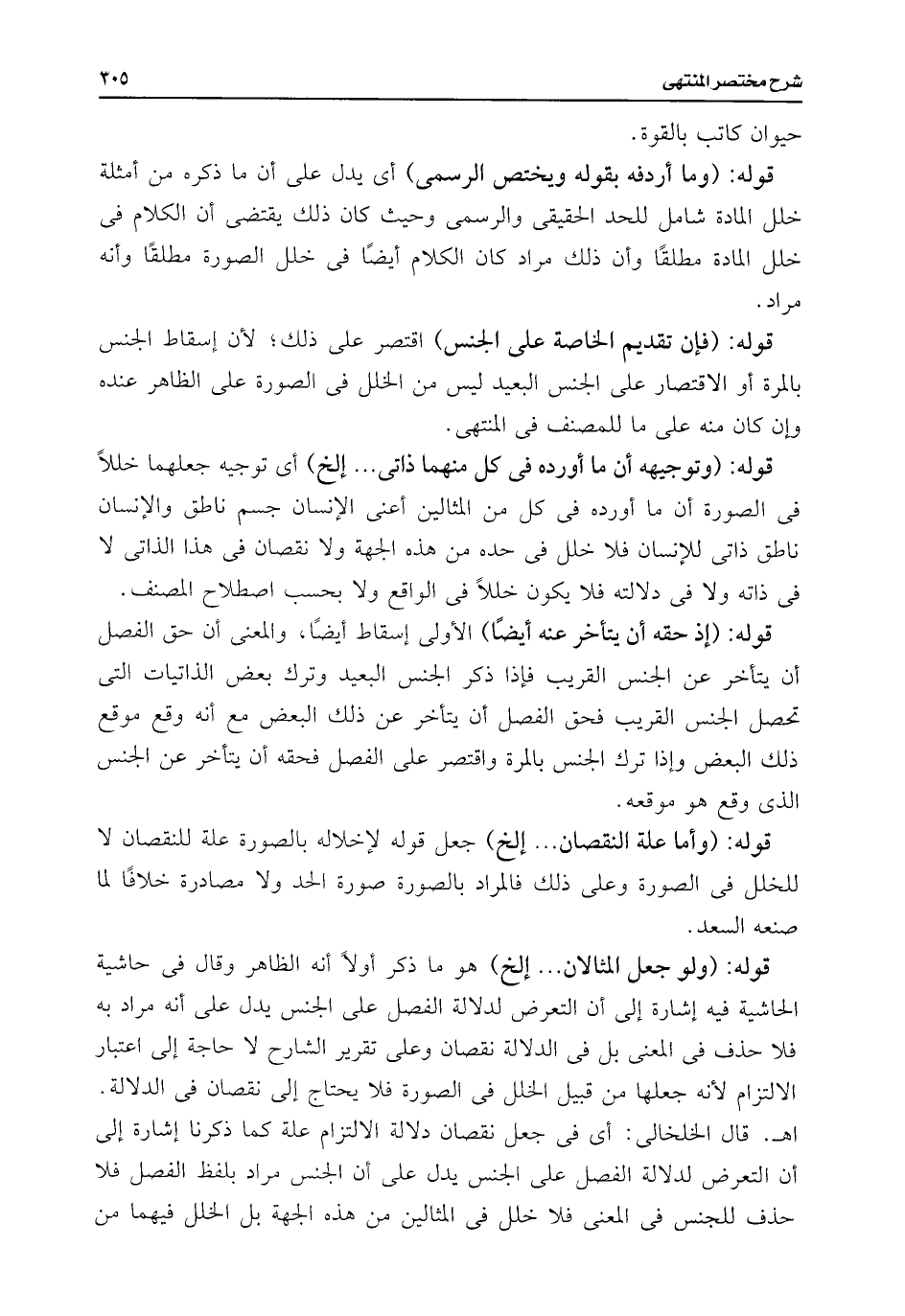 قوله: (فإن تقديم الخاصة على الجنس) اقتصر على ذلك؛ لأن إسقاط الجنس بالمرة أو الاقتصار على الجنس البعيد ليس من الخلل فى الصورة على الظاهر عنده وإن كان منه على ما للمصنف فى المنتهى.