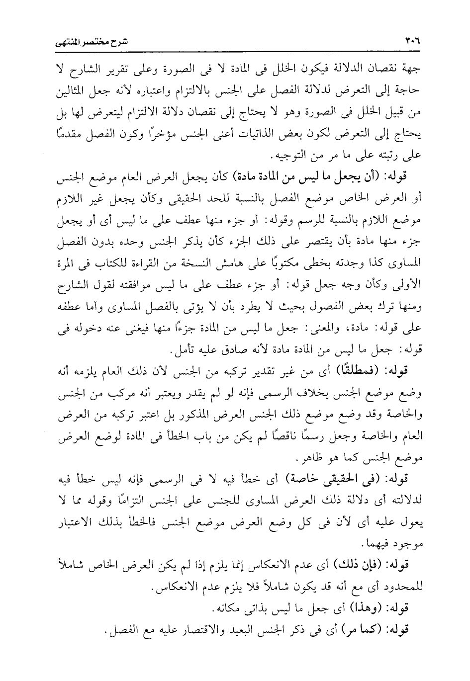 جهة نقصان الدلالة فيكون الخلل فى المادة لا فى الصورة وعلى تقرير الشارح لا حاجة إلى التعرض لدلالة الفصل على الجنس بالالتزام واعتباره لأنه جعل المثالين من قبيل الخلل فى الصورة وهو لا يحتاج إلى نقصان دلالة الالتزام ليتعرض لها بل يحتاج إلى التعرض لكون بعض الذاتيات أعنى الجنس مؤخرًا وكون الفصل مقدمًا على رتبته على ما مر من التوجيه.