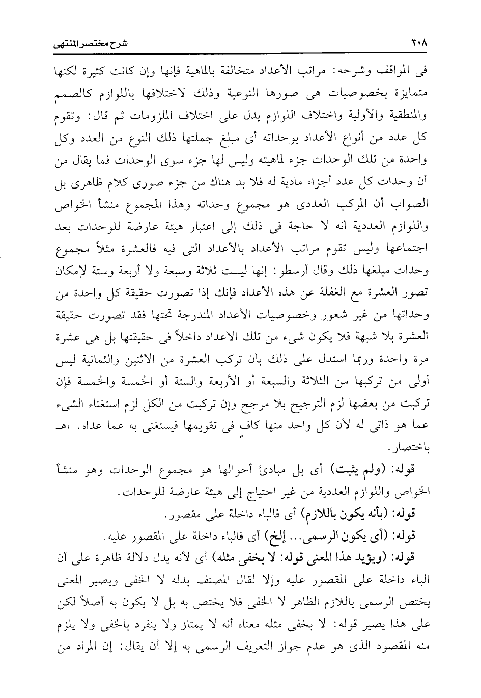 فى المواقف وشرحه: مراتب الأعداد متخالفة بالماهية فإنها وإن كانت كثيرة لكنها متمايزه بخصوصيات هى صورها النوعية وذلك لاختلافها باللوازم كالصمم والمنطقية والأولية واختلاف اللوازم يدى على على اختلاف الملزومات ثم قال: وتقوم كل عدد من أنواع الأعداد بوحداته أى مبلغ جملتها ذلك النوع من العدد وكل واحدة من تلك الوحدات جزء لماهيته وليس لها جزء سوى الوحدات فما يقال من أن وحدات كل عدد أجزاء مادية له فلا بلى هناك من جزء صورى كلام ظاهرى بل الصواب أن المركب العددى هو مجموع وحداته وهذا المجموع منشأ الخواص واللوازم العددية أنه لا حاجة فى ذلك إلى اعتبار هيئة عارضة للوحدات بعد اجتماعها وليس تقوم مراتب الأعداد بالأعداد التى فيه فالعشرة مثلًا مجموع وحدات مبلغها ذلك وقال أرسطو: إنها ليست ثلاثة وسبعة ولا أربعة وستة لإمكان تصور العشرة مع الغفلة عن هذه الأعداد فإنك إذا تصورت حقيقة كل واحدة من وحداتها من غير شعور وخصوصيات الأعداد المندرجة تحتها فقد تصورت حقيقة العشرة بلا شبهة فلا يكون شئ من تلك الأعداد داخلًا فى حقيقتها بل هى عشرة مرة واحدة وربما استدل على ذلك بأن تركب العشرة من الاثنين والثمانية ليس أولى من تركبها من الثلاثة والسبعة أو الأربعة والستة أو الخمسة والخمسة فإن تركبت من بعضها لزم الترجيح بلا مرجح وإن تركبت من الكل لزم استغناء الشئ عما هو ذاتى له لأن كل واحد منها كافٍ فى تقويمها فيستغنى به عما عداه. اهـ باختصار.