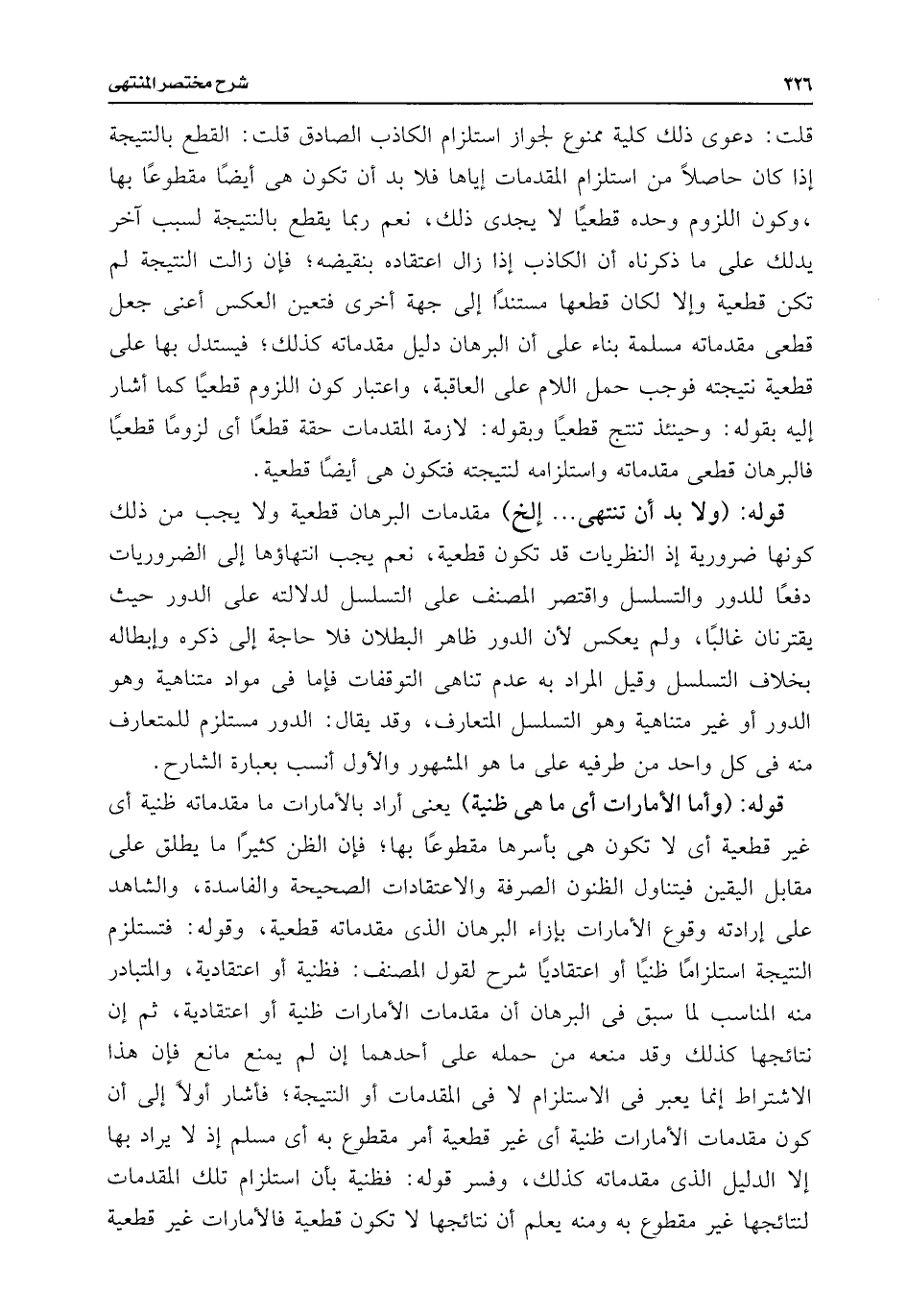 قلت: دعوى ذلك كلية ممنوع لجواز استلزام الكاذب الصادق قلت: القطع بالنتيجة إذا كان حاصلًا من استلزام المقدمات إياها فلا بد أن تكون هى أيضًا مقطوعًا بها، وكون اللزوم وحده قطعيًا لا يجدى ذلك، نعم ربما يقطع بالنتيجة لسبب آخر يدلك على ما ذكرناه أن الكاذب إذا زال اعتقاده بنقيضه؛ فإن زالت النتيجة لم تكن قطعية وإلا لكان قطعها مستندًا إلى جهة أخرى فتعين العكس أعنى جعل قطعى مقدماته مسلمة بناء على أن البرهان دليل مقدماته كذلك؛ فيستدل بها على قطعية نتيجته فوجب حمل اللام على العاقبة، واعتبار كون اللزوم قطعيًا كما أشار إليه بقوله: وحينئذ تنتج قطعيًا وبقوله: لازمة المقدمات حقة قطعًا أى لزومًا قطعيًا فالبرهان قطعى مقدماته واستلزامه لنتيجته فتكون هى أيضًا قطعية.