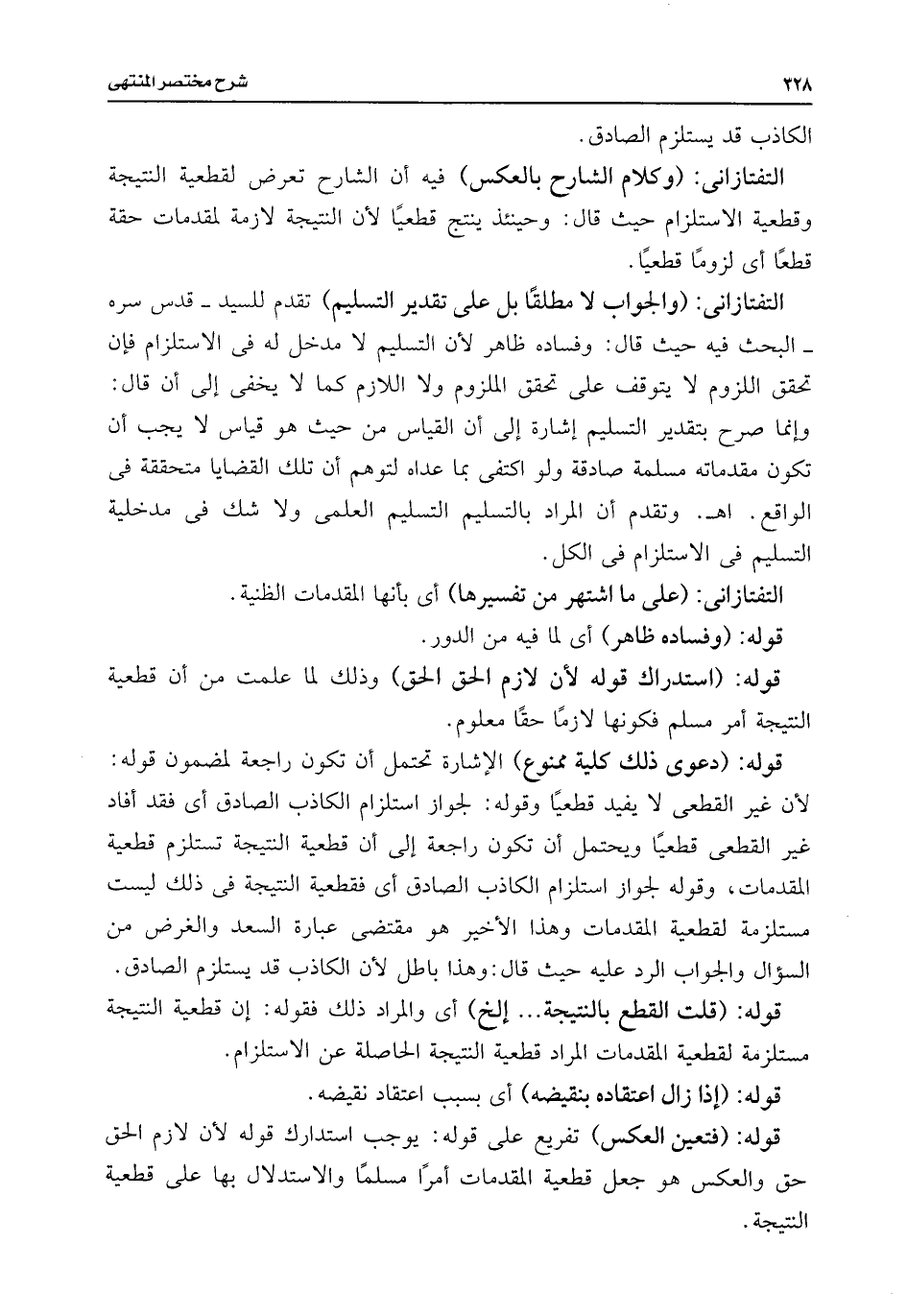 التفتازانى: (وكلام الشارح بالعكس) فيه أن الشارح تعرض لقطعية النتيجة وقطعية الاستلزام حيث قال: وحينئذ ينتج قطعيًا لأن النتيجة لازمة لقدمات حقة قطعًا أى لزومًا قطعيًا.
