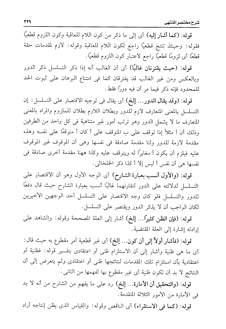 قوله: (وقد يقال الدور. . . إلخ) أى يقال فى توجيه الاقتصار على التسلسل: إن التسلسل بالمعنى المتعارف لازم للدور وبطلان اللازم بطلان للملزوم والمراد بالمعنى المتعارف ما لا يشمل الدور وهو ترتب أمور غير متناهية فى كل واحد من الطرفين وذلك أن أمثلًا إذا توقف على ب المتوقف على أكان أمتوقفًا على نفسه وهذه مقدمة لازمة للدور ولنا مقدمة صادقة فى نفسها وهى أن الموقوف غير الموقوف عليه فيلزم أن يكون أمغايرًا له ويتوقف عليه وكذا ههنا مقدمة أخرى صادقة فى نفسها هى أن نفس أليس إلا أكذا ذكر الخلخالى.