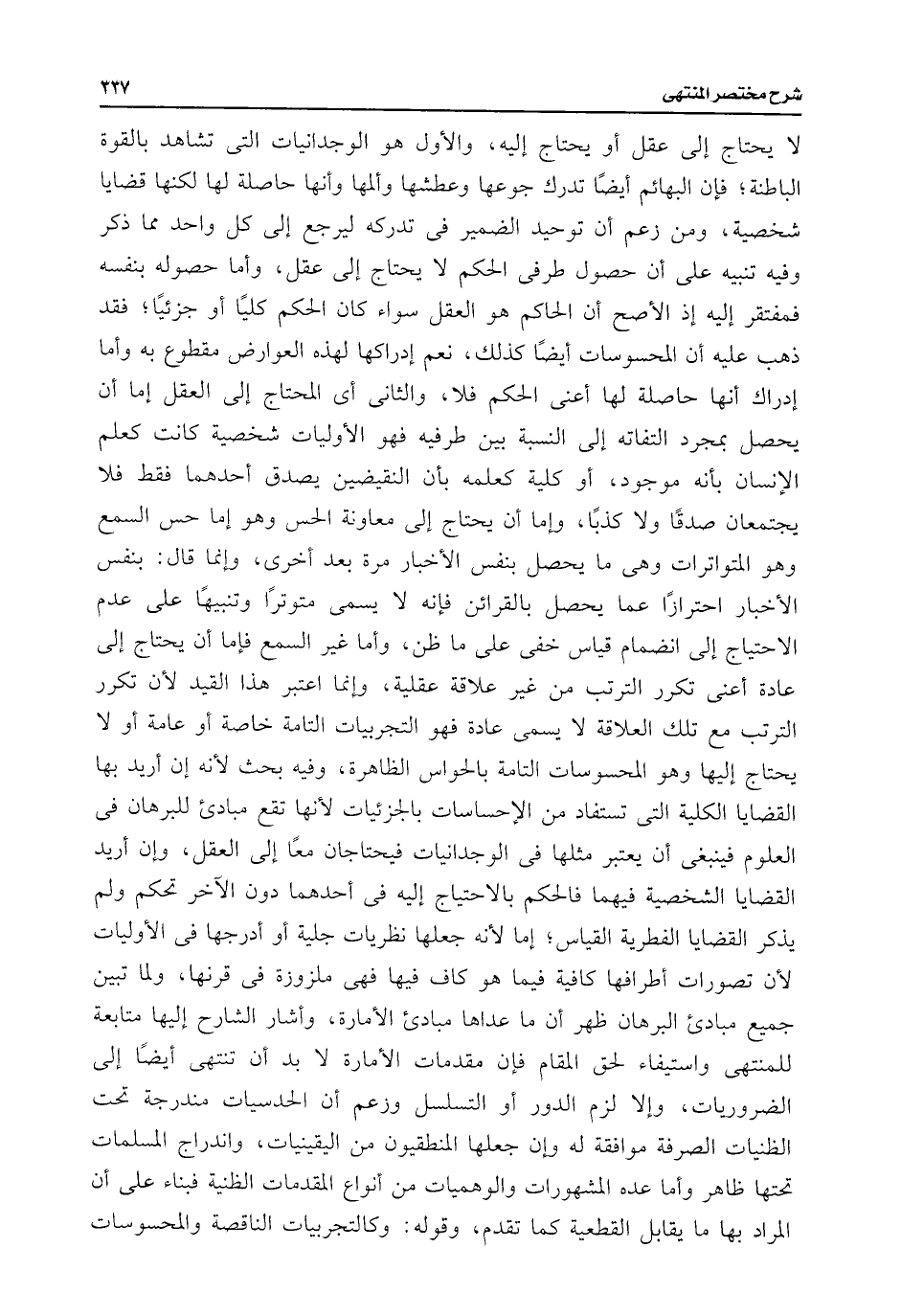 لا يحتاج إلى عقل أو يحتاج إليه، والأول هو الوجدانيات التى تشاهد بالقوة الباطنة؛ فإن البهائم أيضًا تدرك جوعها وعطشها وألمها وأنها حاصلة لها لكنها قضايا شخصية، ومن زعم أن توحيد الضمير فى تدركه ليرجع إلى كل واحد مما ذكر وفيه تنبيه على أن حصول طرفى الحكم لا يحتاج إلى عقل، وأما حصوله بنفسه فمفتقر إليه إذ الأصح أن الحاكم هو العقل سواء كان الحكم كليًا أو جزئيًا؛ فقد ذهب عليه أن المحسوسات أيضًا كذلك، نعم إدراكها لهذه العوارض مقطوع به وأما إدراك أنها حاصلة لها أعنى الحكم فلا، والثانى أى المحتاج إلى العقل إما أن يحصل بمجرد التفاته إلى النسبة بين طرفيه فهو الأوليات شخصية كانت كعلم الإنسان بأنه موجود، أو كلية كعلمه بأن النقيضين يصدق أحدهما فقط فلا يجتمعان صدقًا ولا كذبًا، وإما أن يحتاج إلى معاونة الحس وهو إما حس السمع وهو المتواترات وهى ما يحصل بنفس الأخبار مرة بعد أخرى، وإنما قال: بنفس الأخبار احترازًا عما يحصل بالقرائن فإنه لا يسمى متوترًا وتنبيهًا على عدم الاحتياج إلى انضمام قياس خفى على ما ظن، وأما غير السمع فإما أن يحتاج إلى عادة أعنى تكرر الترتب من غير علاقة عقلية، وإنما اعتبر هذا القيد لأن تكرر الترتب مع تلك العلاقة لا يسمى عادة فهو التجربيات التامة خاصة أو عامة أو لا يحتاج إليها وهو المحسوسات التامة بالحواس الظاهرة، وفيه بحث لأنه إن أريد بها القضايا الكلية التى تستفاد من الإحساسات بالجزئيات لأنها تقع مبادئ للبرهان فى العلوم فينبغى أن يعتبر مثلها فى الوجدانيات فيحتاجان معًا إلى العقل، وإن أريد القضايا الشخصية فيهما فالحكم بالاحتياج إليه فى أحدهما دون الآخر تحكم ولم يذكر القضايا الفطرية القياس؛ إما لأنه جعلها نظريات جلية أو أدرجها فى الأوليات لأن تصورات أطرافها كافية فيما هو كاف فيها فهى ملزوزه فى قرنها، ولما تبين جميع مبادئ البرهان ظهر أن ما عداها مبادئ الأمارة، وأشار الشارح إليها متابعة للمنتهى واستيفاء لحق المقام فإن مقدمات الأمارة لا بد أن تنتهى أيضًا إلى الضروريات، وإلا لزم الدور أو التسلسل وزعم أن الحدسيات مندرجة تحت الظنيات الصرفة موافقة له وإن جعلها المنطقيون من اليقينيات، واندراج المسلمات تحتها ظاهر وأما عده المشهورات والوهميات من أنواع المقدمات الظنية فبناء على أن المراد بها ما يقابل القطعية كما تقدم، وقوله: وكالتجربيات الناقصة والمحسوسات