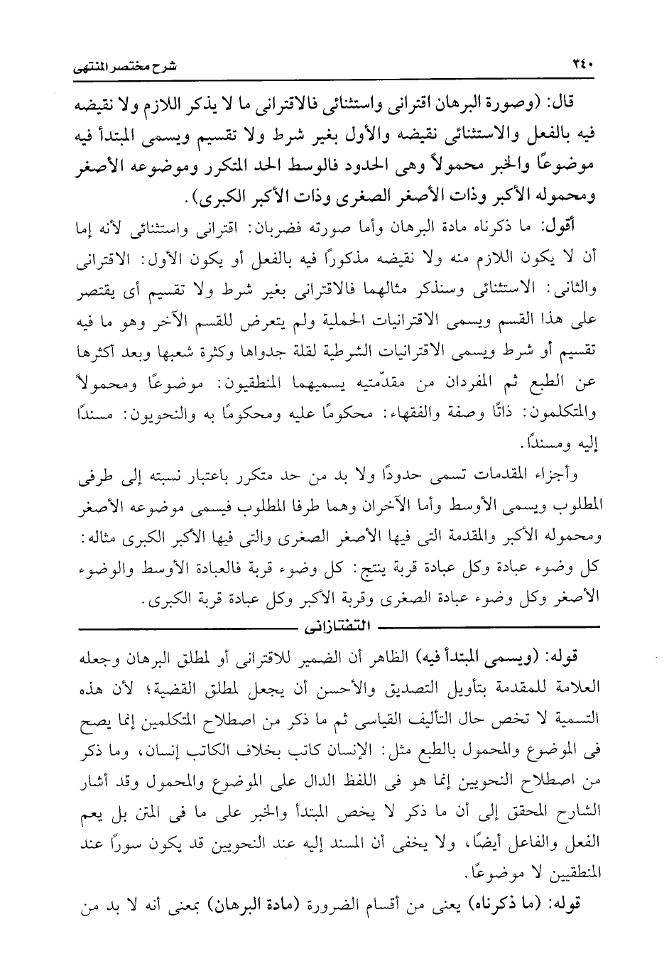قال: (وصورة البرهان اقترانى واستثنائى فالاقترانى ما لا يذكر اللازم ولا نقيضه فيه بالفعل والاستثنائى نقيضه والأول بغير شرط ولا تقسيم ويسمى المبتدأ فيه موضوعًا والخبر محمولًا وهى الحدود فالوسط الحد المتكرر وموضوعه الأصغر ومحموله الأكبر وذات الأصغر الصغرى وذات الأكبر الكبرى).