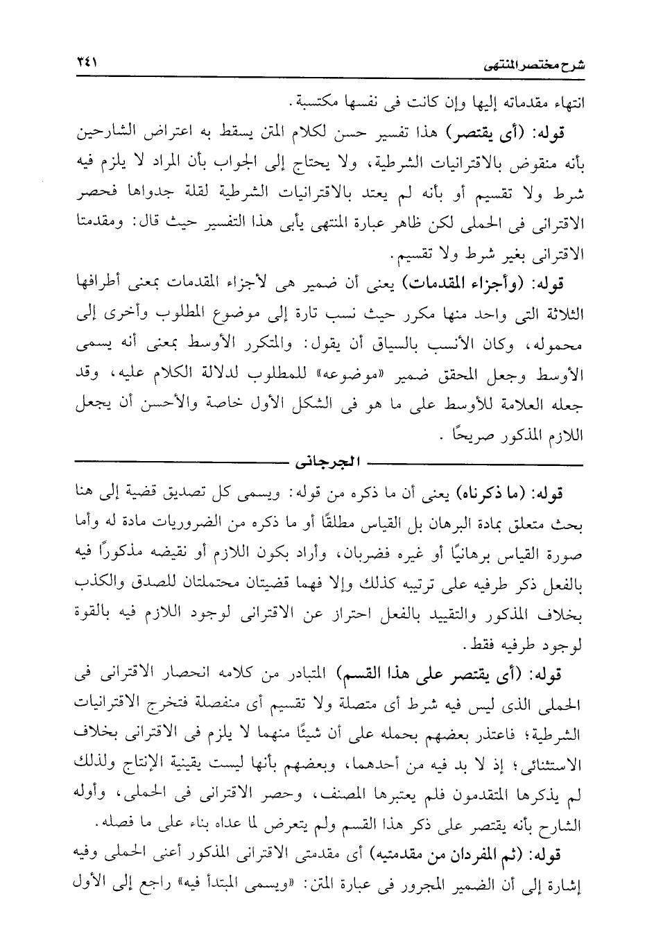 قوله: (أى يقتصر) هذا تفسير حسن لكلام المتن يسقط به اعتراض الشارحين بأنه منقوض بالاقترانيات الشرطية، ولا يحتاج إلى الجواب بأن المراد لا يلزم فيه شرط ولا تقسيم أو بأنه لم يعتد بالاقترانيات الشرطية لقلة جدواها فحصر الاقترانى فى الحملى لكن ظاهر عبارة المنتهى يأبى هذا التفسير حيث قال: ومقدمتا الاقترانى بغير شرط ولا تقسيم.