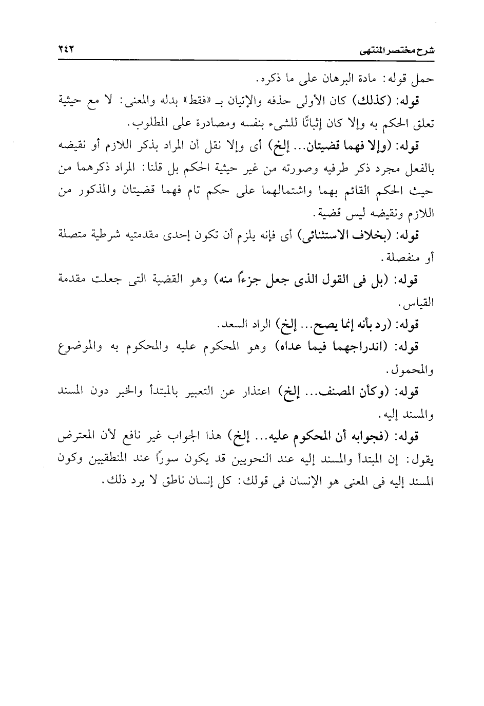 قوله: (فجوابه أن المحكوم عليه. . . إلخ) هذا الجواب غير نافع لأن المعترض يقول: إن المبتدأ والمسند إليه عند النحويين قد يكون سورًا عند المنطقيين وكون المسند إليه فى المعنى هو الإنسان فى قولك: كل إنسان ناطق لا يرد ذلك.